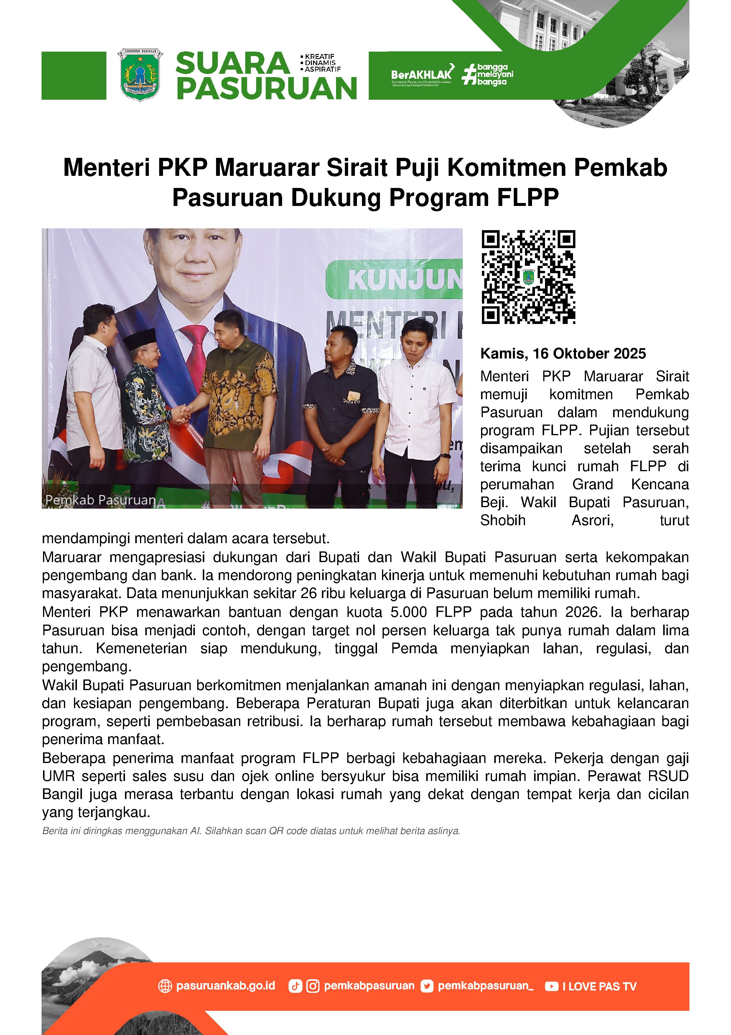 Menteri Perumahan dan Kawasan Permukiman (PKP) Maruarar Sirait mengapresiasi langkah dan komitmen Pemerintah Kabupaten Pasuruan yang mendukung penuh program kredit perumahan rakyat Fasilitas Likuiditas Pembiayaan Perumahan (FLPP).
