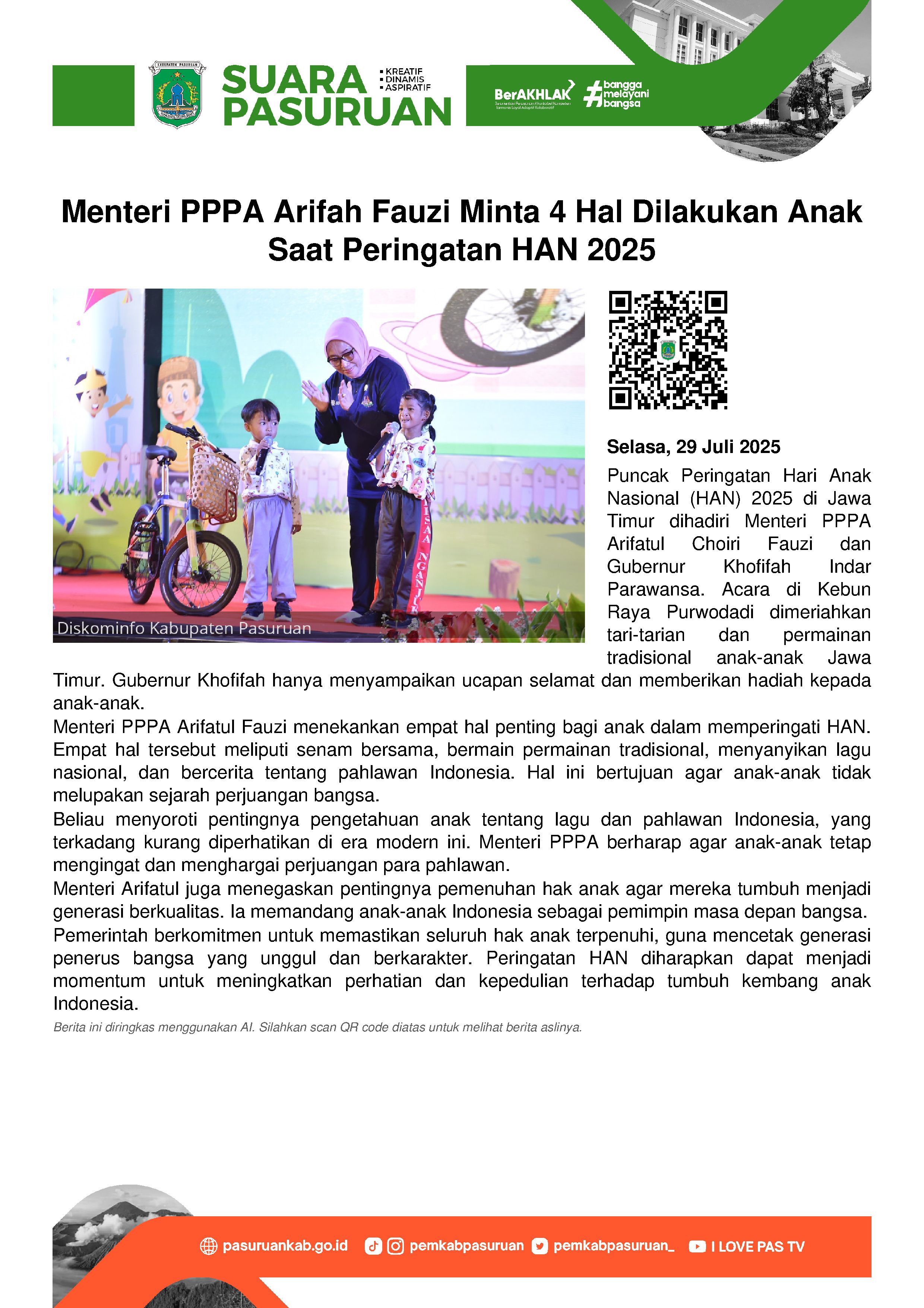 Pemerintah Provinsi Jawa Timur menggelar Puncak Peringatan Hari Anak Nasional (HAN) tahun 2025 di Kebun Raya Purwodadi, Kabupaten Pasuruan, Selasa (29/7).