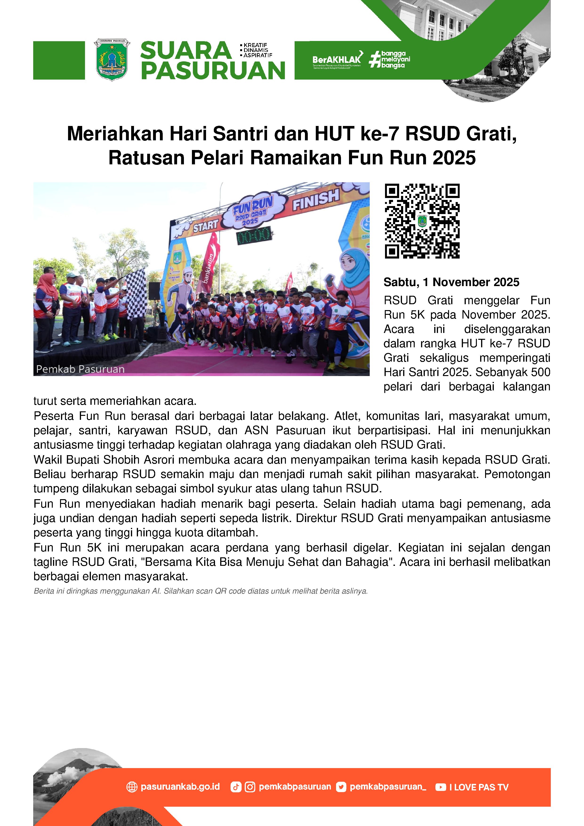 Membuka lembar baru di bulan November 2025, RSUD Grati menggelar Fun Run 5K. Sedikitnya 500 pelari meramaikan lomba lari yang khusus dihelat dalam rangka Hari Ulang Tahun ke-7 RSUD Grati sekaligus rangkaian Hari Santri 2025.