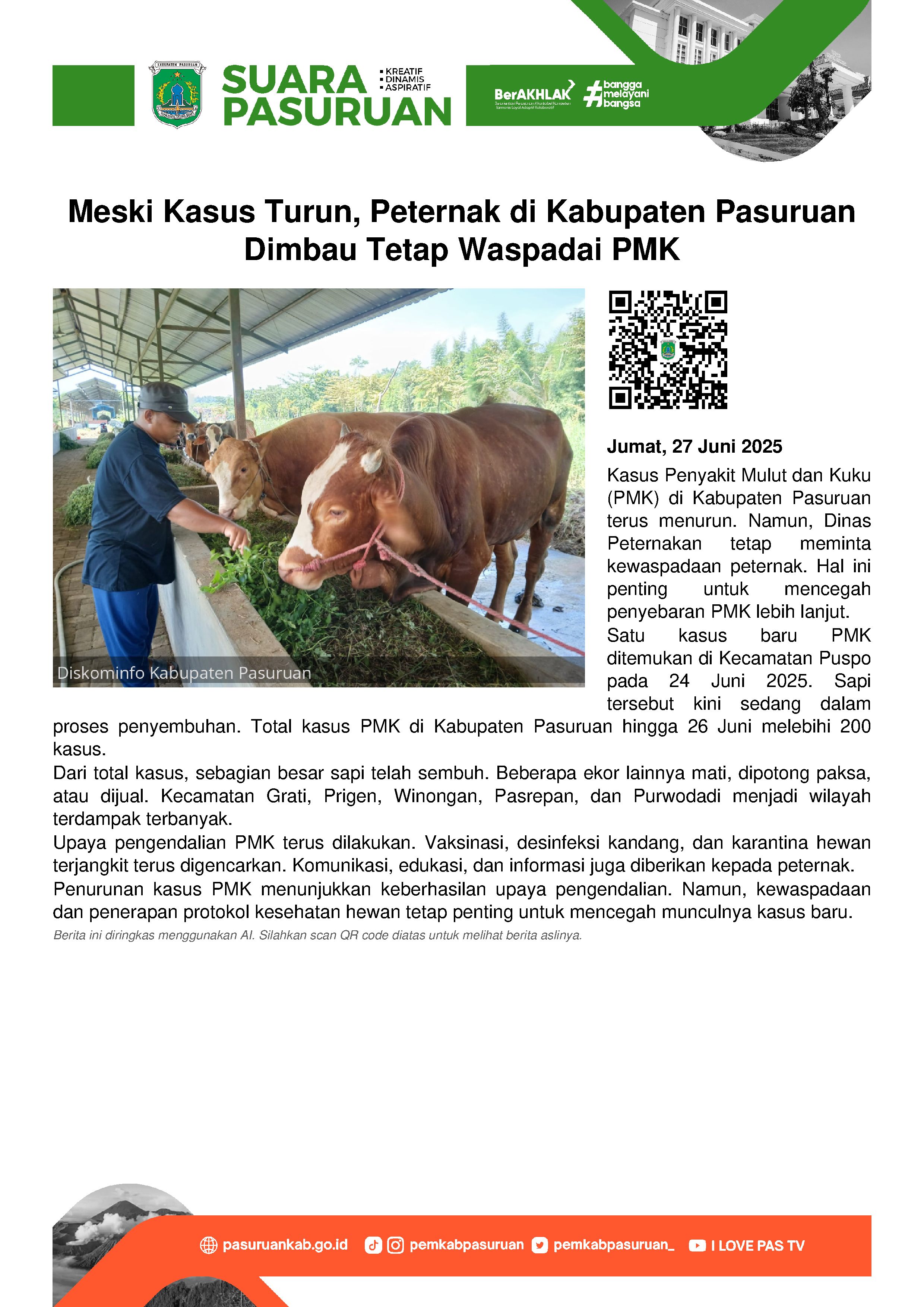 Dari data terbaru Disnakkeswan Kabupaten Pasuruan, per 26 Juni 2025 kemarin, jumlah kasus PMK di Kabupaten Pasuruan tercatat lebih dari 200 kasus.