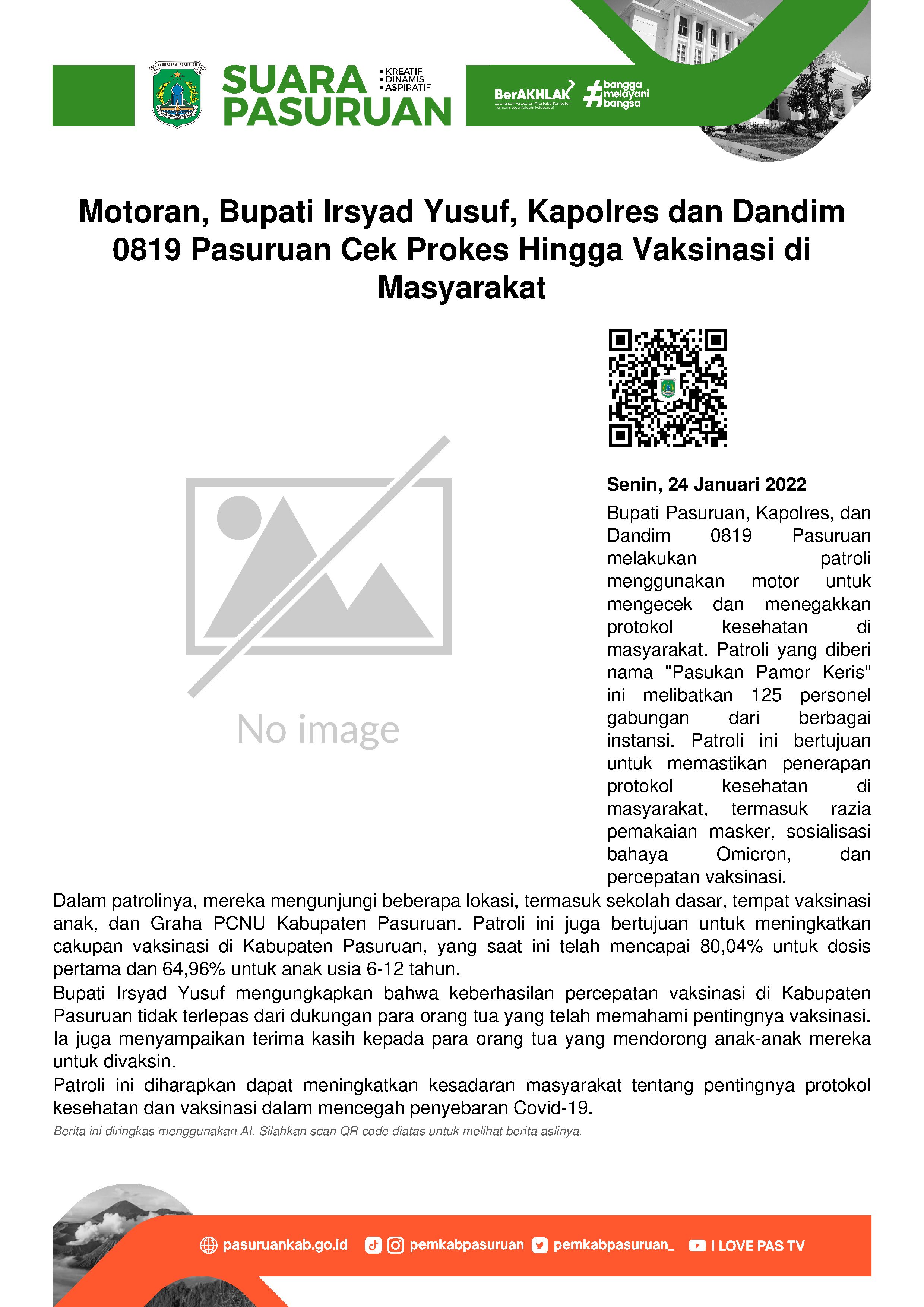 Dalam patroli ini, total ada 125 personel gabungan yang dilibatkan. Mulai dari anggota Polres Pasuruan, Kodim 0819 Pasuruan, Satpol PP, Dinas Perhubungan serta Banser (Barisan Ansor Serbaguna). Mereka siap untuk membantu menegakkan protokol kesehatan. Mulai dari razia pemakaian masker, sosialisasi bahaya Omicron hingga percepatan vaksinasi di Kabupaten Pasuruan.