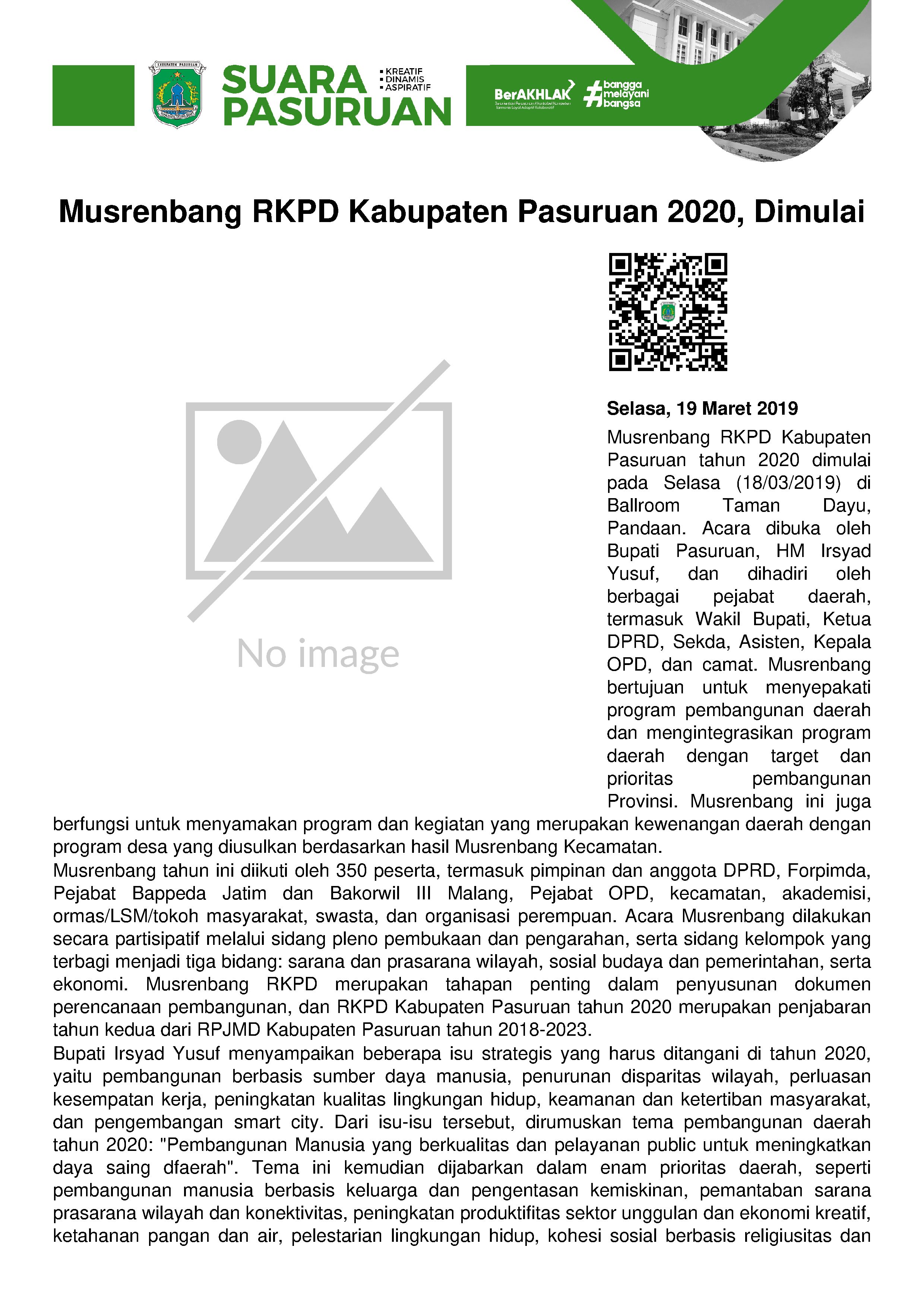Musrenbang (Musyawarah Perencanaan Pembangunan) RKPD Kabupaten Pasuruan tahun 2020, dimulai.