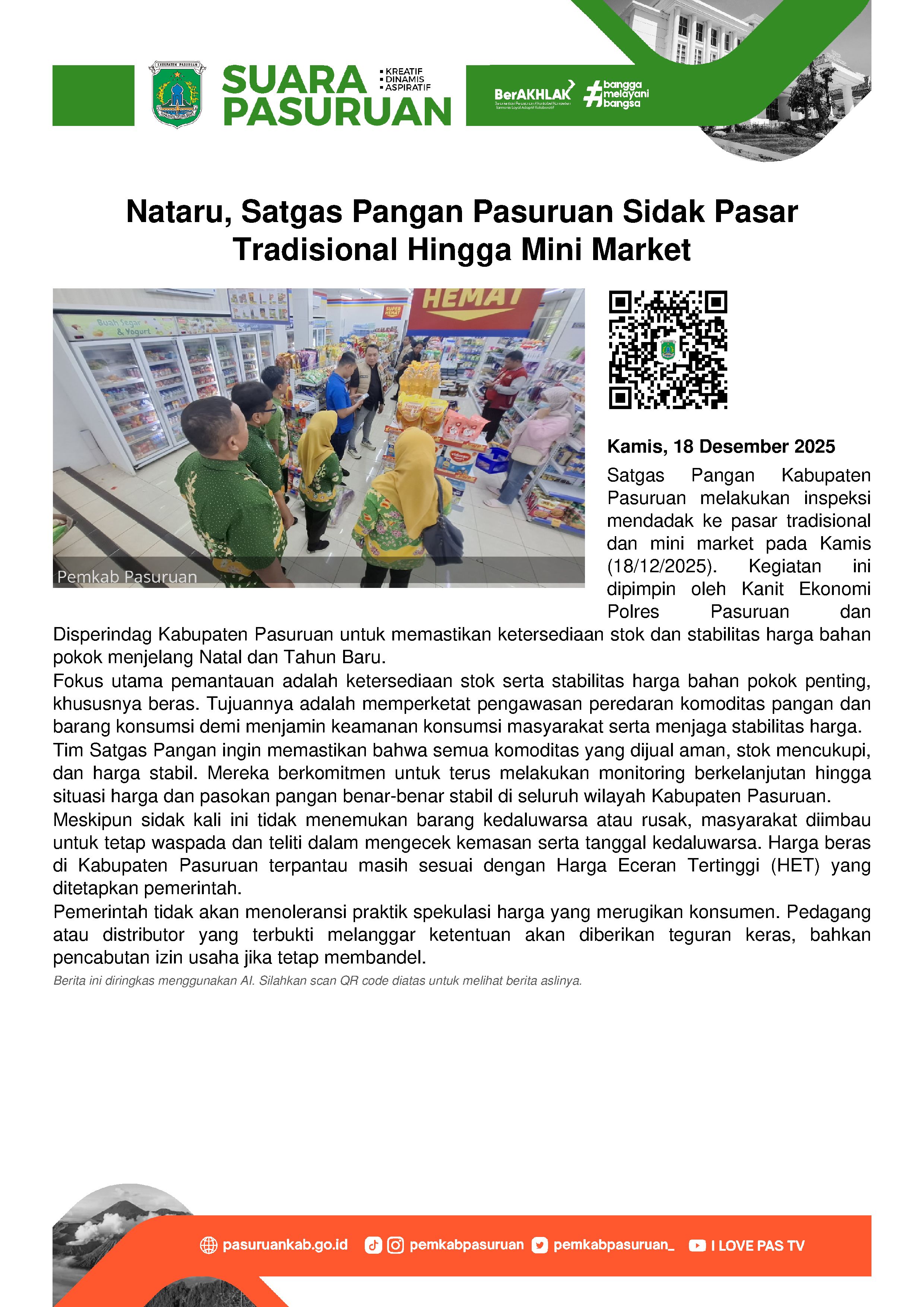 Satuan Tugas (Satgas) Pangan Kabupaten Pasuruan menggelar inspeksi mendadak (sidak) sejumlah pasar tradisional maupun pasar ritel di wilayah Kabupaten Pasuruan, Kamis (18/12/2025).