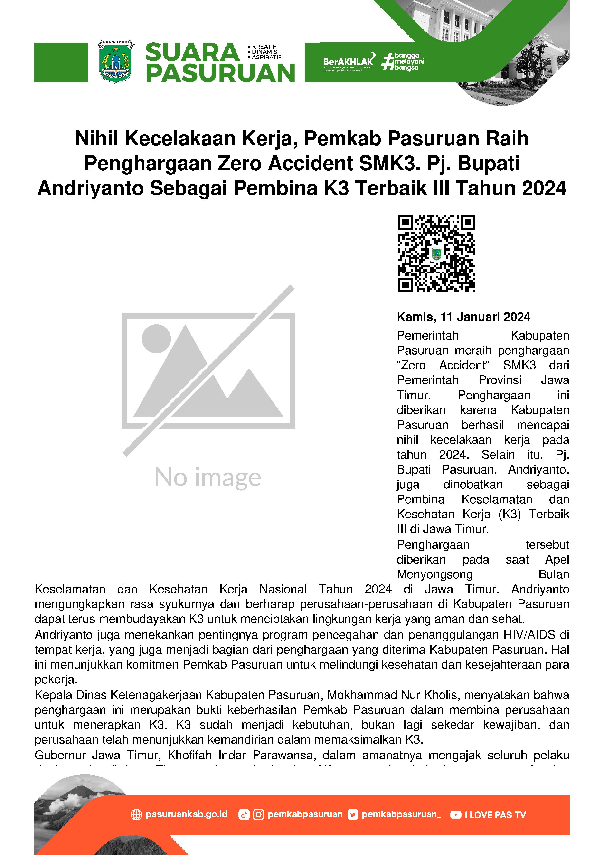 Di awal tahun 2024, Pemerintah Kabupaten Pasuruan mendapatkan apresiasi dari Pemerintah Provinsi Jawa Timur. Capaian prestasi yang diperoleh hari ini, Kamis (11/1/2024) yakni penghargaan Kecelakaan Nihil (Zero Accident) Sistem Manajemen Keselamatan dan Kesehatan Kerja (SMK3) serta Pencegahan dan Penanggulangan HIV/AIDS di Tempat Kerja.
