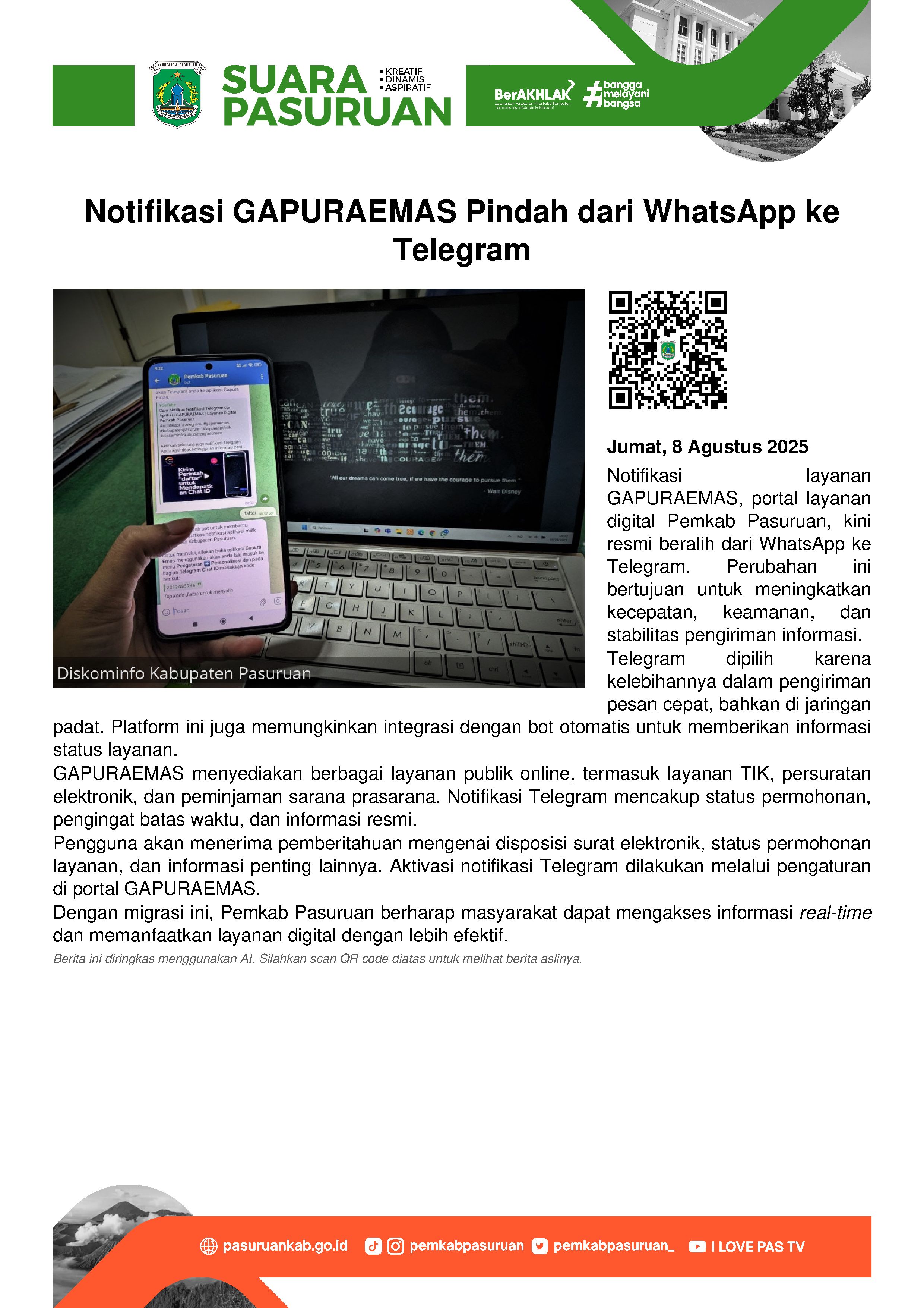 Pasuruan, 07 Agustus 2025 – Mulai hari ini, semua notifikasi layananPortal GAPURAEMAS tidak lagi dikirim lewat WhatsApp, tetapi sudah resmi pindah ke Telegram.