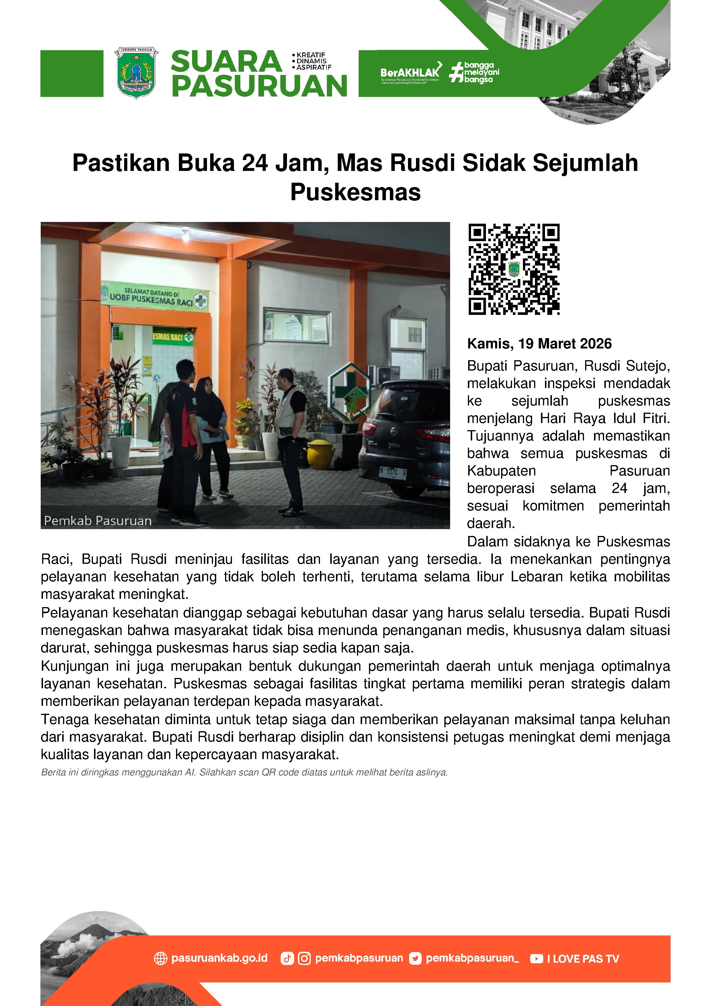 Seperti yang terlihat pada Rabu (18/3/2026) malam, Mas Rusdi - sapaan akrab Bupati Pasuruan ini melakukan sidak ke Puskesmas Raci.