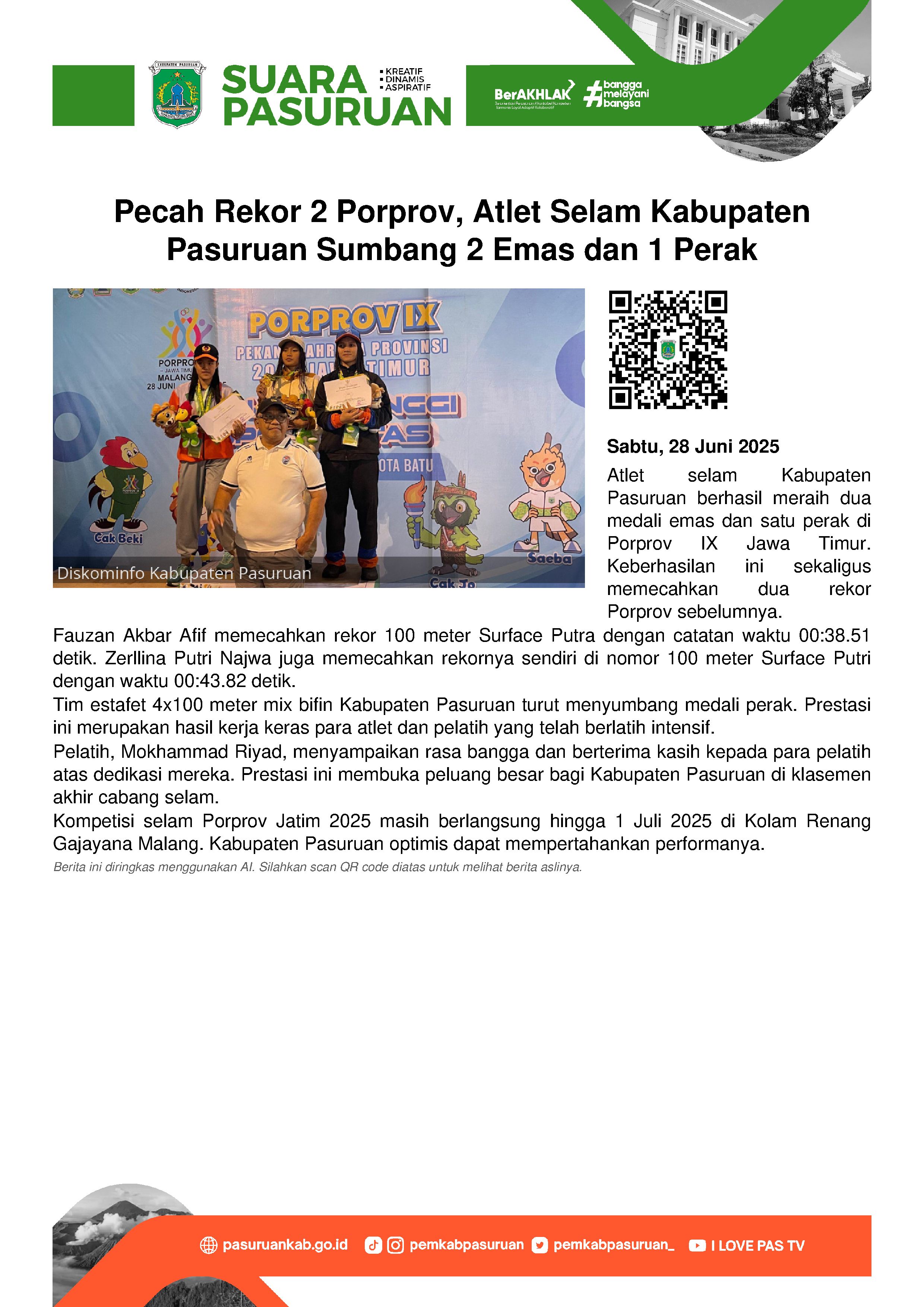 Kali ini, atlet-atlet selam Kabupaten Pasuruan berhasil menyabet dua medali emas dan satu medali perak, sekaligus memecahkan dua rekor PORPROV.
