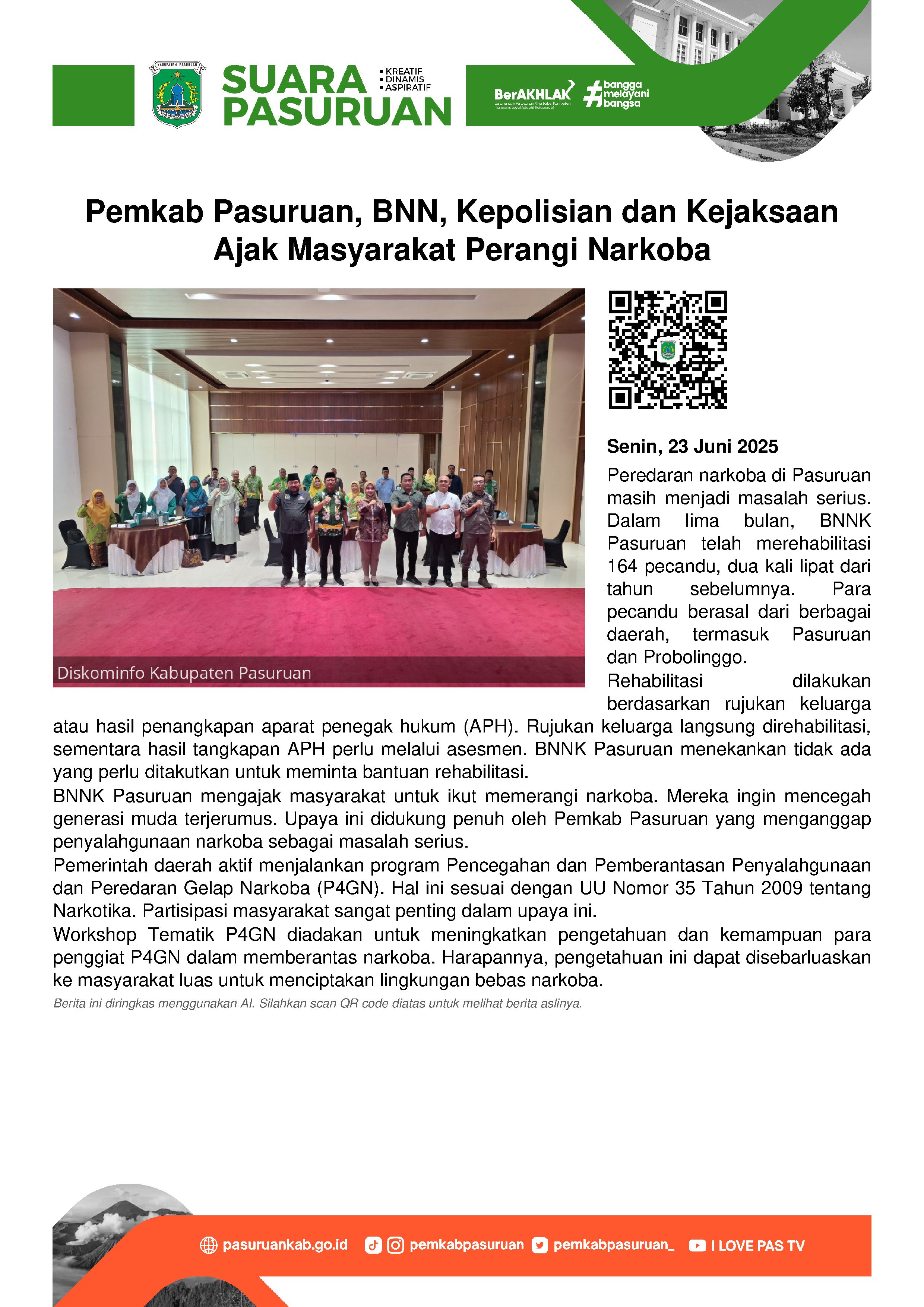Peredaran dan penyalahgunaan narkotika dan obat-obatan terlarang (Narkoba) di Indonesia hingga kini masih menjadi pekerjaan rumah (PR) besar untuk menyelesaikannya. Termasuk di wilayah Kota dan Kabupaten Pasuruan.