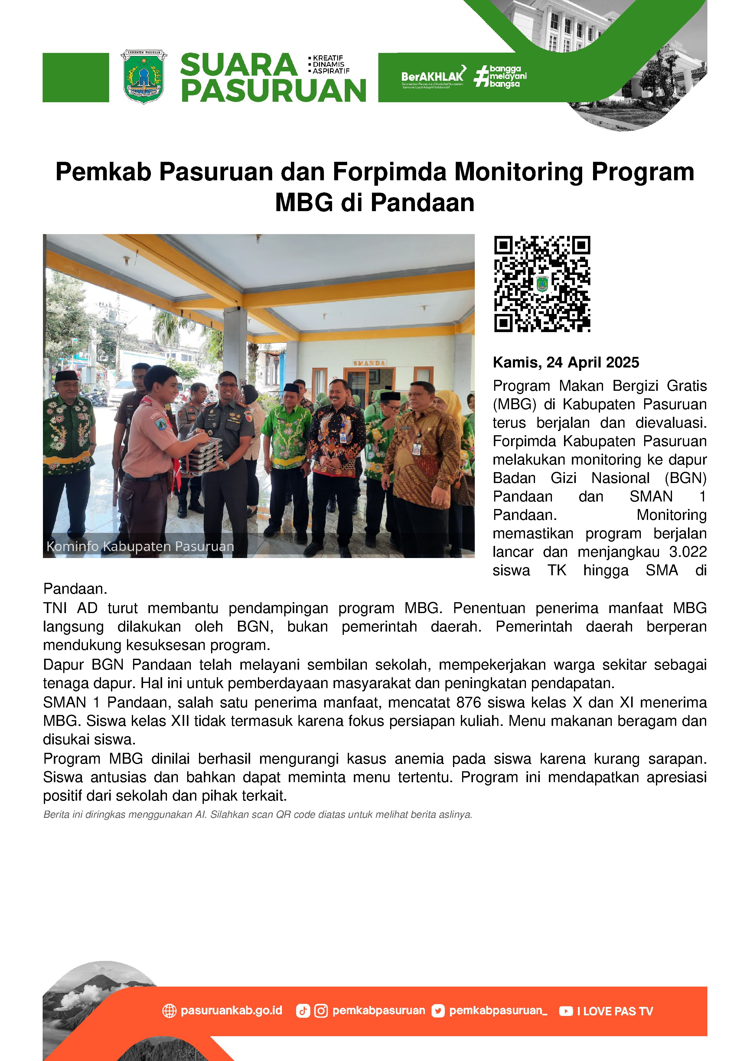 Menurut Dandim, tujuan digelarnya monitoring tak lain untuk memastikan program tetap berjalan dengan baik. Terutama terhadap 3.022 siswa TK hingga SMA di Kecamatan Pandaan yang setiap hari senin hingga jumat menerima program MBG dengan menu beragam.