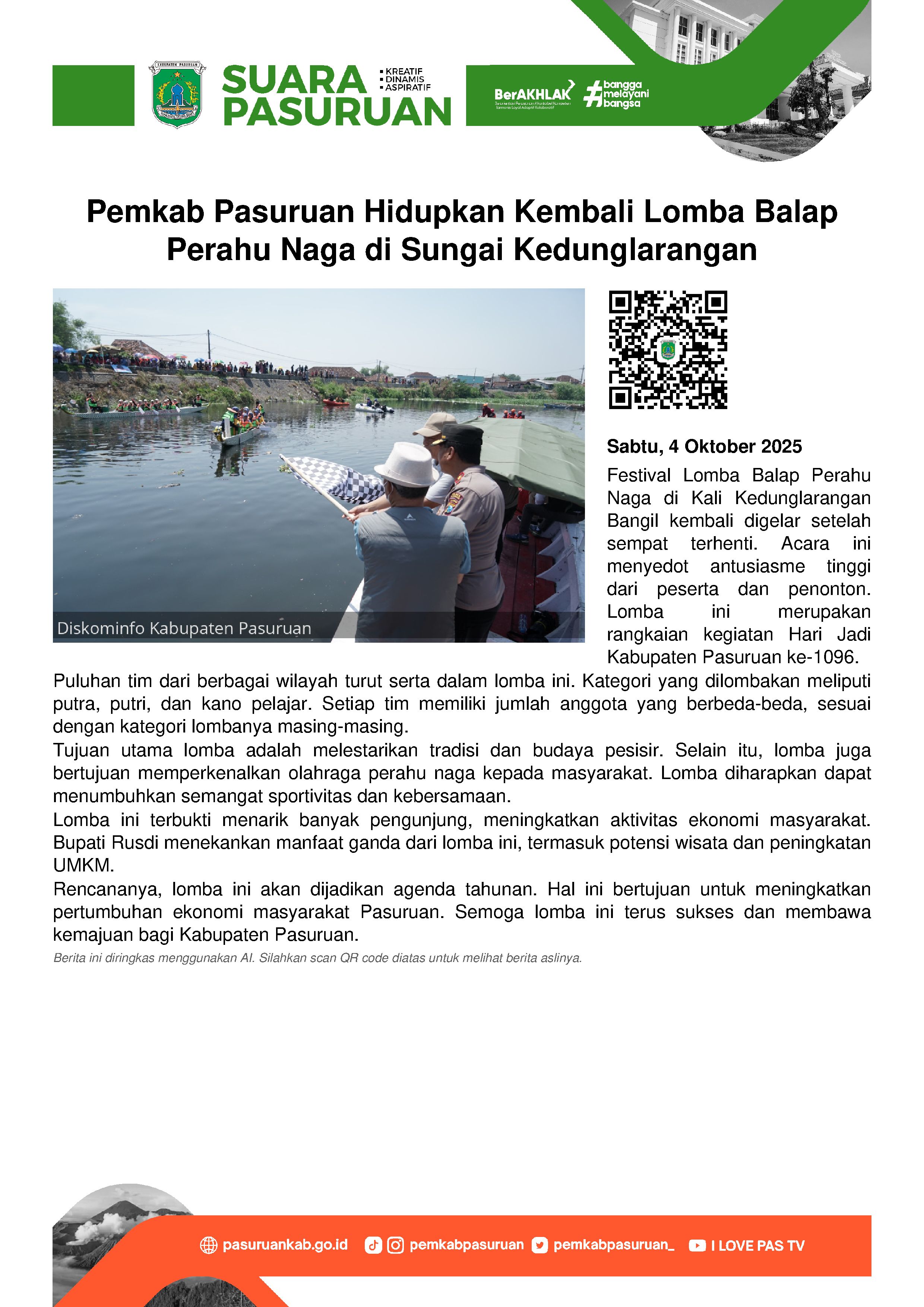 Festival dan Lomba Balap Perahu Dayung Naga yang sempat digelar pada tahun 2019 di Kali Kedunglarangan Bangil, kini dihidupkan kembali.