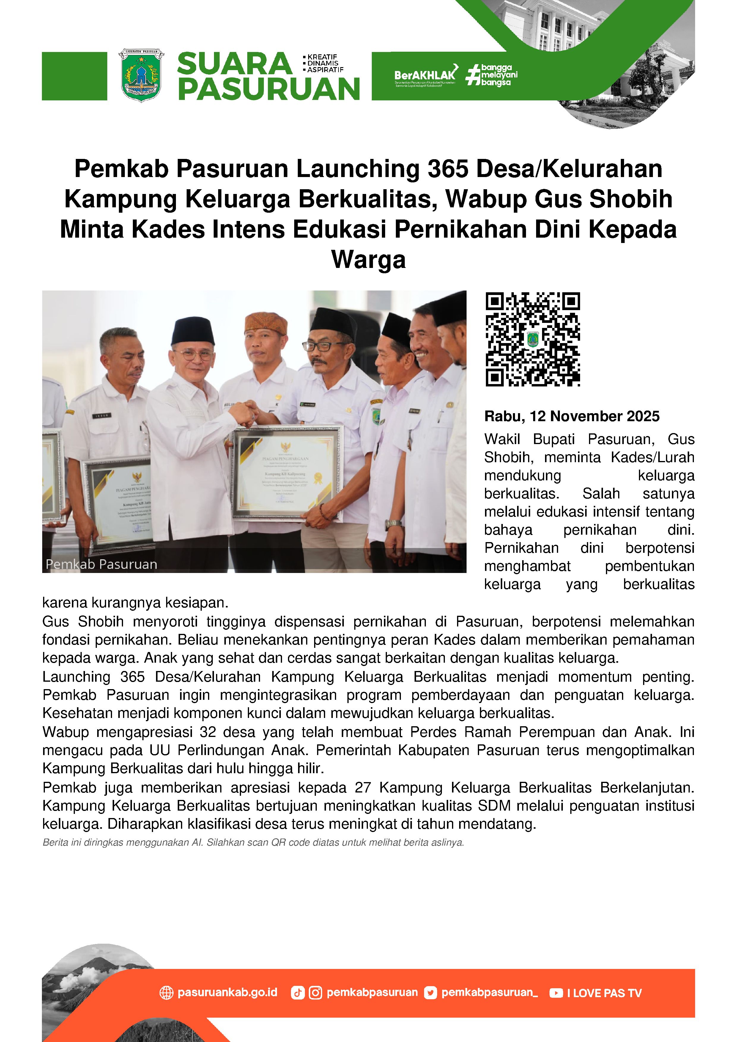 Masih di momen yang sama, Pemerintah Kabupaten Pasuruan memberikan apresiasi kepada 27 Kampung Keluarga Berkualitas Berkelanjutan. Secara simbolis, Piagam Penghargaan diserahkan oleh Wabup Gus Shobih kepada Kepala Desa yang tersebar di 17 Kecamatan. Diantaranya ditujukan kepada Desa Dawuhansengon dan Desa Jatisari, Kecamatan Purwodadi; Desa Ngadirejo dan Desa Kalipucang, Kecamatan Tutur; Desa Pohgedang dan Desa Pasrepan, Kecamatan Pasrepan; Oro-oro Puleh, Kecamatan Kejayan dan Desa Jatigunting, Kecamatan Wonorejo.