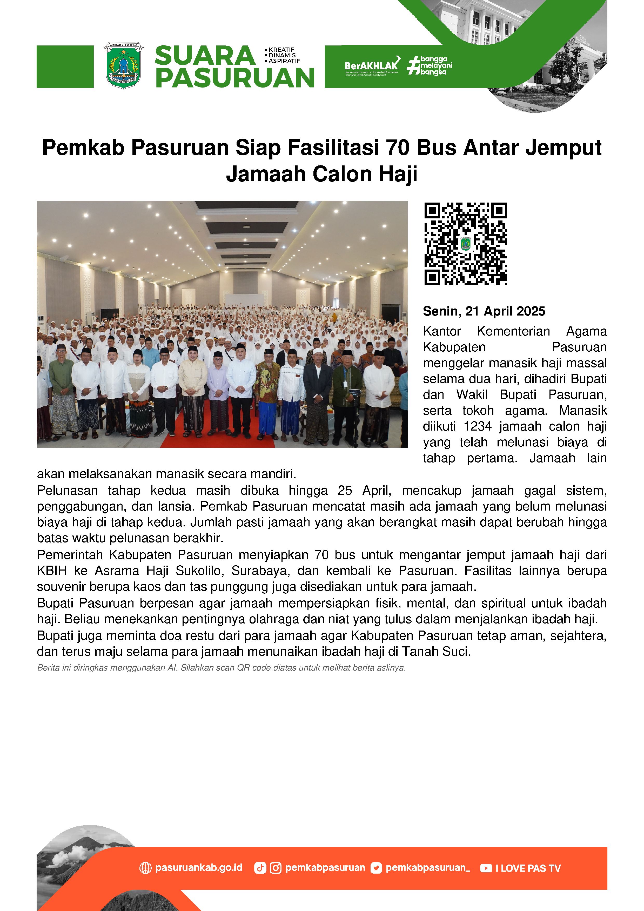 Tak hanya memfasilitasi urusan armada, Mas Rusdi - sapaan akrab Bupati Pasuruan ini juga menyiapkan souvenir untuk para jamaah berupa kaos dan tas punggung sebagai wadah sepatu ataupun sandal.