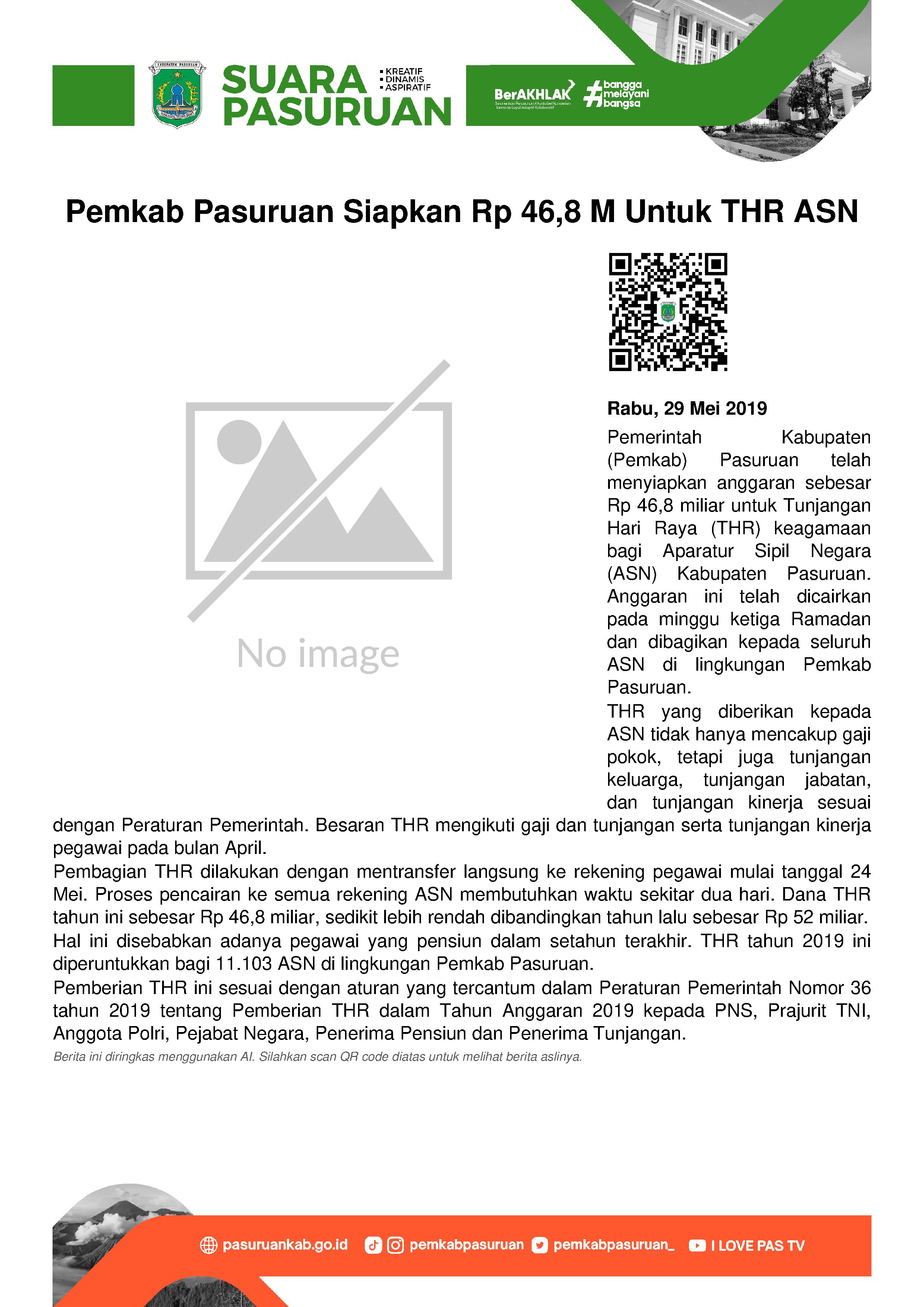 Luly Noermadiono, Kepala Badan Keuangan Daerah Kabupaten Pasuruan mengatakan, dari Pemkab Pasuruan sudah menyiapkan anggaran untuk pemberian THR ASN. Hal ini sesuai dengan Aturan tentang THR pada Peraturan Pemerintah (PP) Nomor 36 tahun 2019 tentang Pemberian THR dalam Tahun Anggaran 2019 kepada PNS, Prajurit TNI, Anggota Polri, Pejabat Negara, Penerima Pensiun dan Penerima Tunjangan.