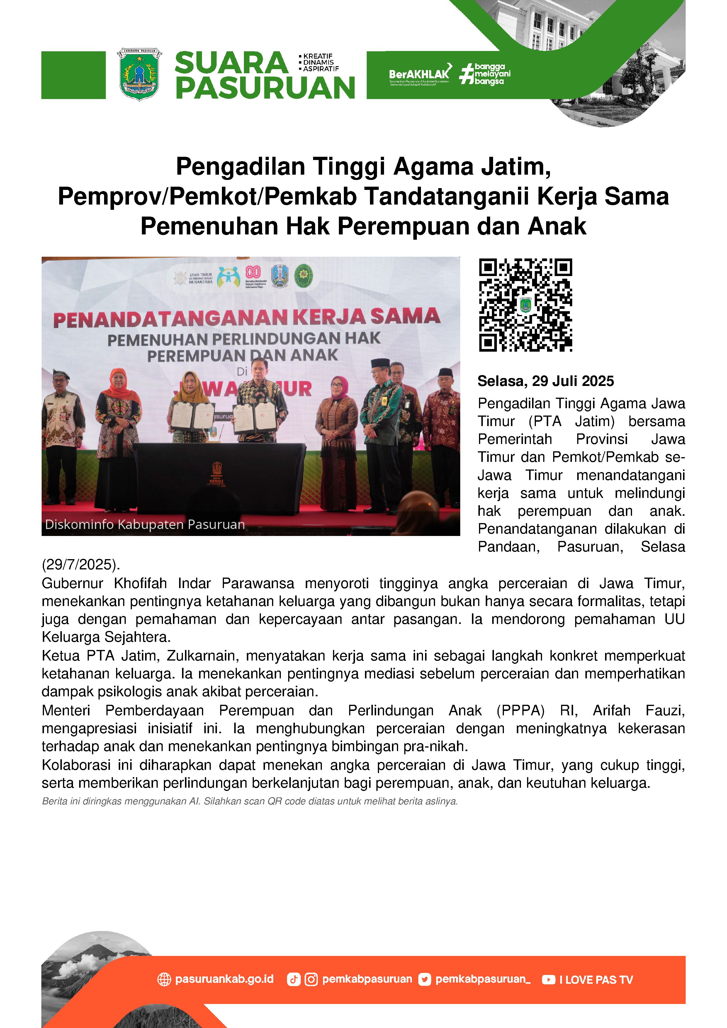 Pengadilan Tinggi Agama bersama Pemerintah Provinsi Jawa Timur dan Pemkot/Pemkab se-Jawa Timur menandatangani kerja sama pemenuhan perlindungan hak perempuan dan anak, Selasa (29/7/2025).