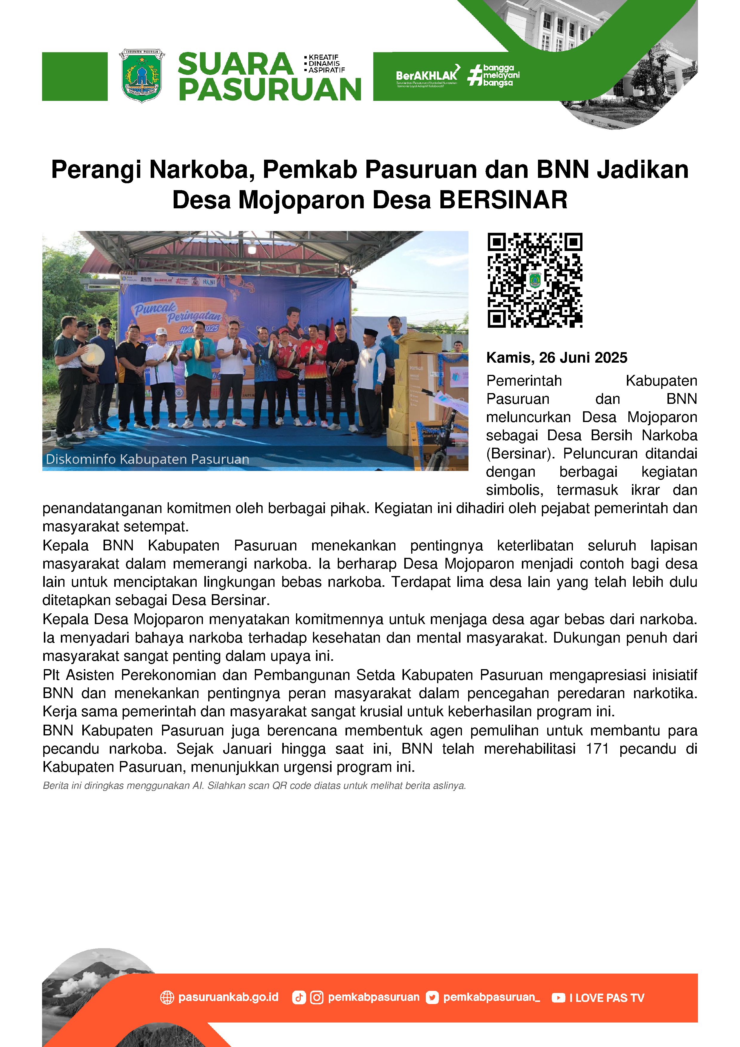 Peluncuran Desa Bersinar itu dilaksanakan di Taman Ganjaran Rosella, Desa Mojoparon, Kamis (26/6/2025) pagi, dan dihadiri Kepala BNN Kabupaten Pasuruan, Masduki; Plt Asisten Perekonomian dan Pembangunan Setda Kabupaten Pasuruan, Bakti Jati Permana; Kadispora Mujiono dan undangan lainnya.