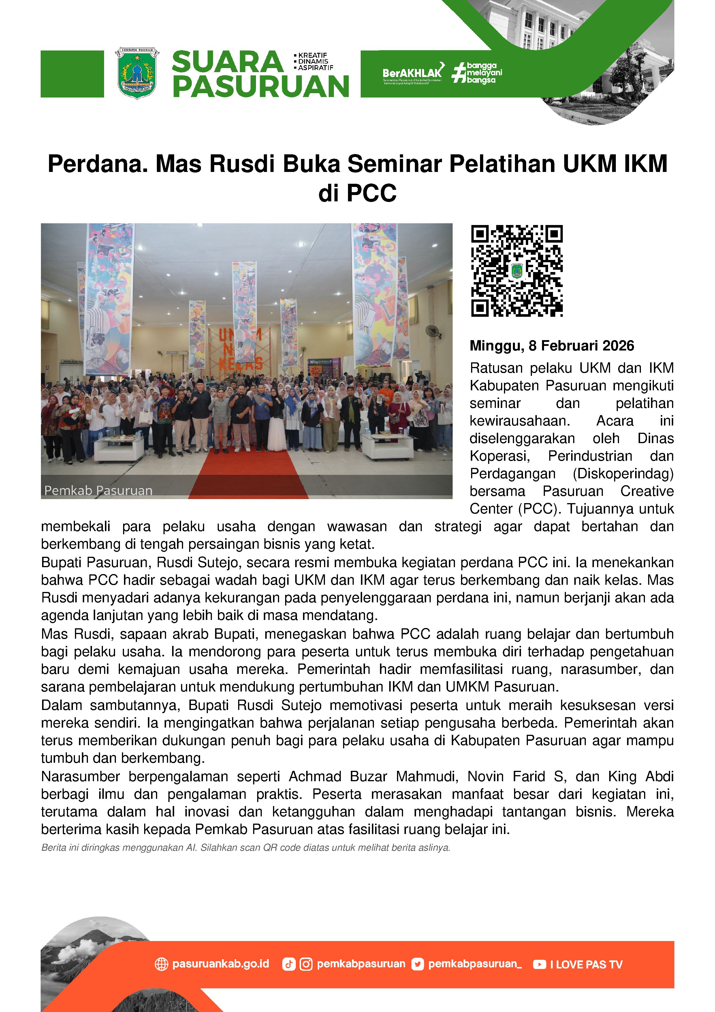 Mas Rusdi, sapaan akrabnya, menegaskan PCC dihadirkan sebagai ruang belajar dan bertumbuh bagi pelaku IKM dan UMKM di Pasuruan agar mampu naik kelas.
