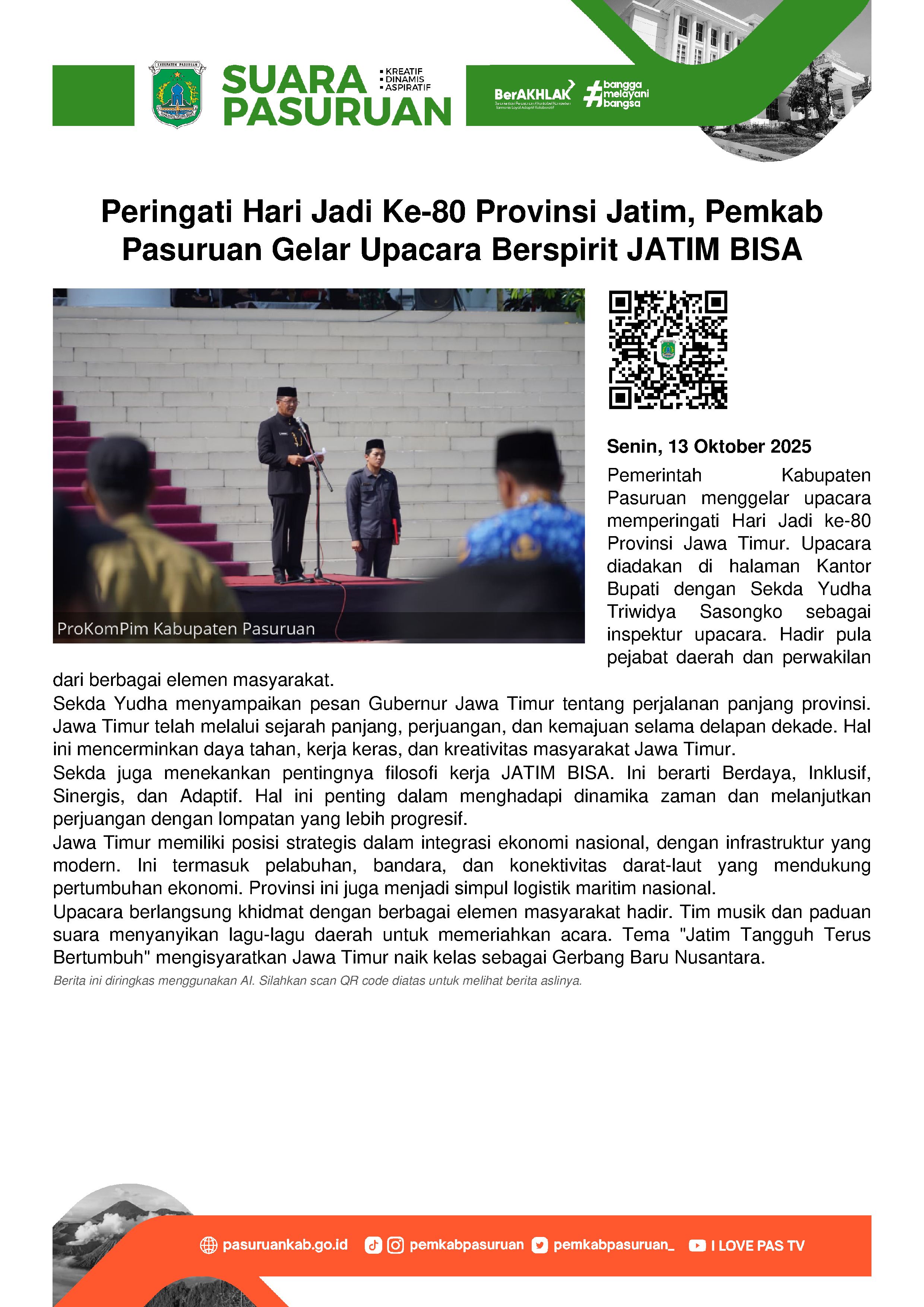 Memperingati Hari Jadi ke-80 Provinsi Jawa Timur, hari ini, Senin (13/10/2025), Pemerintah Kabupaten Pasuruan menggelar upacara di halaman Gedung Kantor Bupati, Kompleks Perkantoran Kabupaten Pasuruan. Bertindak sebagai Inspektur Upacara, Sekretaris Daerah (Sekda) Yudha Triwidya Sasongko dan Perwira Upacara, Kepala Dinas Pemberdayaan Masyarakat dan Desa Kabupaten Pasuruan, M. Agus Masjhady.