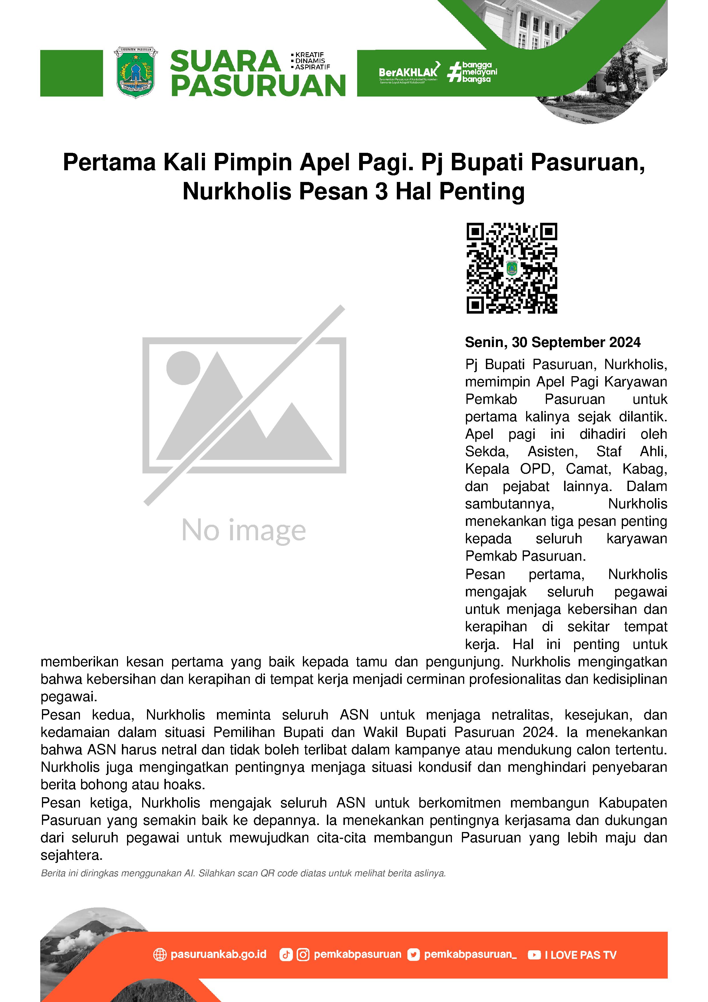 Dalam sambutannya, Nurkholis mengawali prakatanya dengan perkenalan. Setelah itu, ada tiga pesan penting yang ia sampaikan untuk selanjutnya dilaksanakan oleh seluruh karyawan Pemkab Pasuruan.