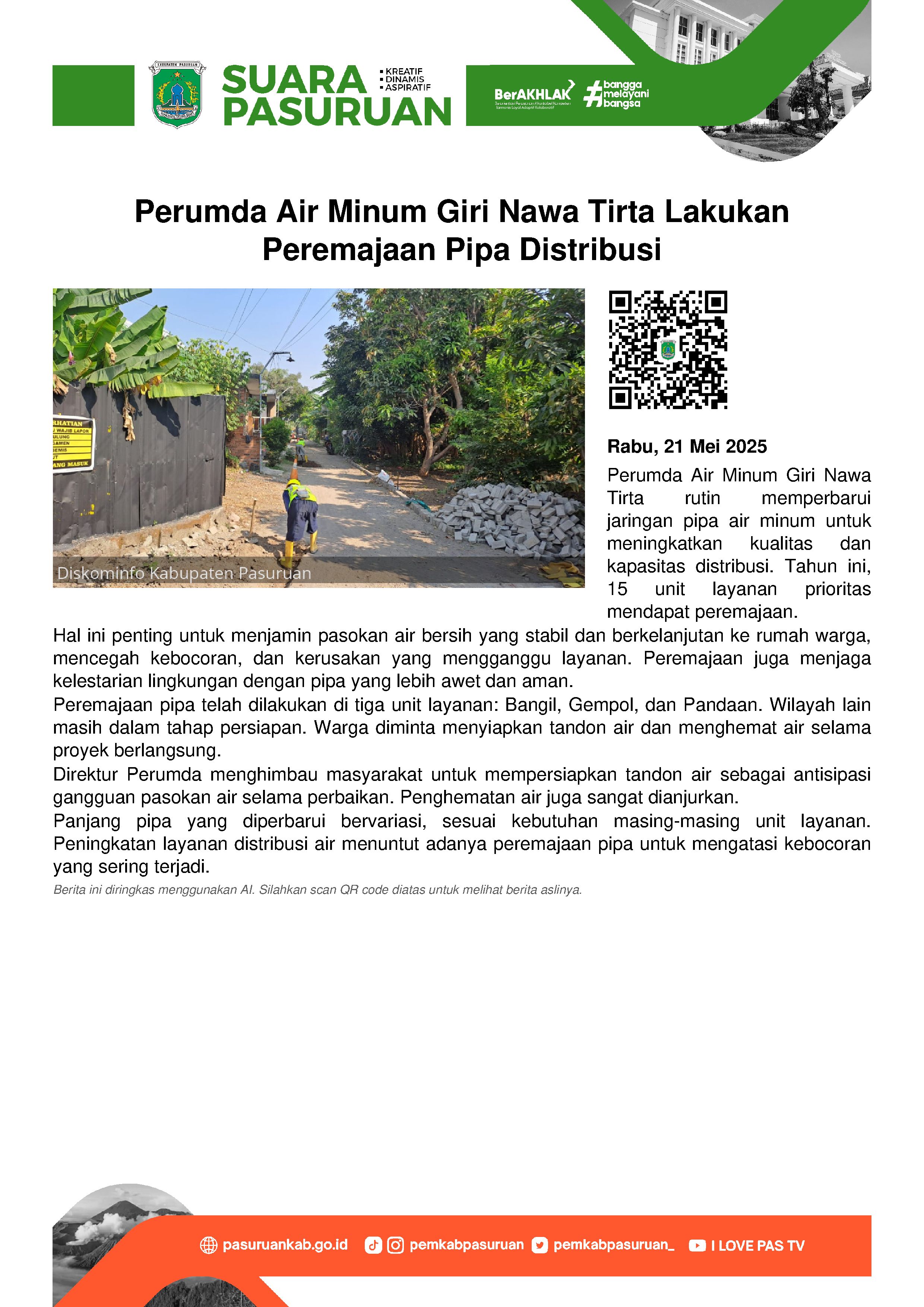 Direktur Perumda Air Minum Giri Nawa Tirta, Zaari menjelaskan peremajaan jaringan ini penting untuk memastikan pasokan air yang stabil dan berkelanjutan ke rumah-rumah warga.