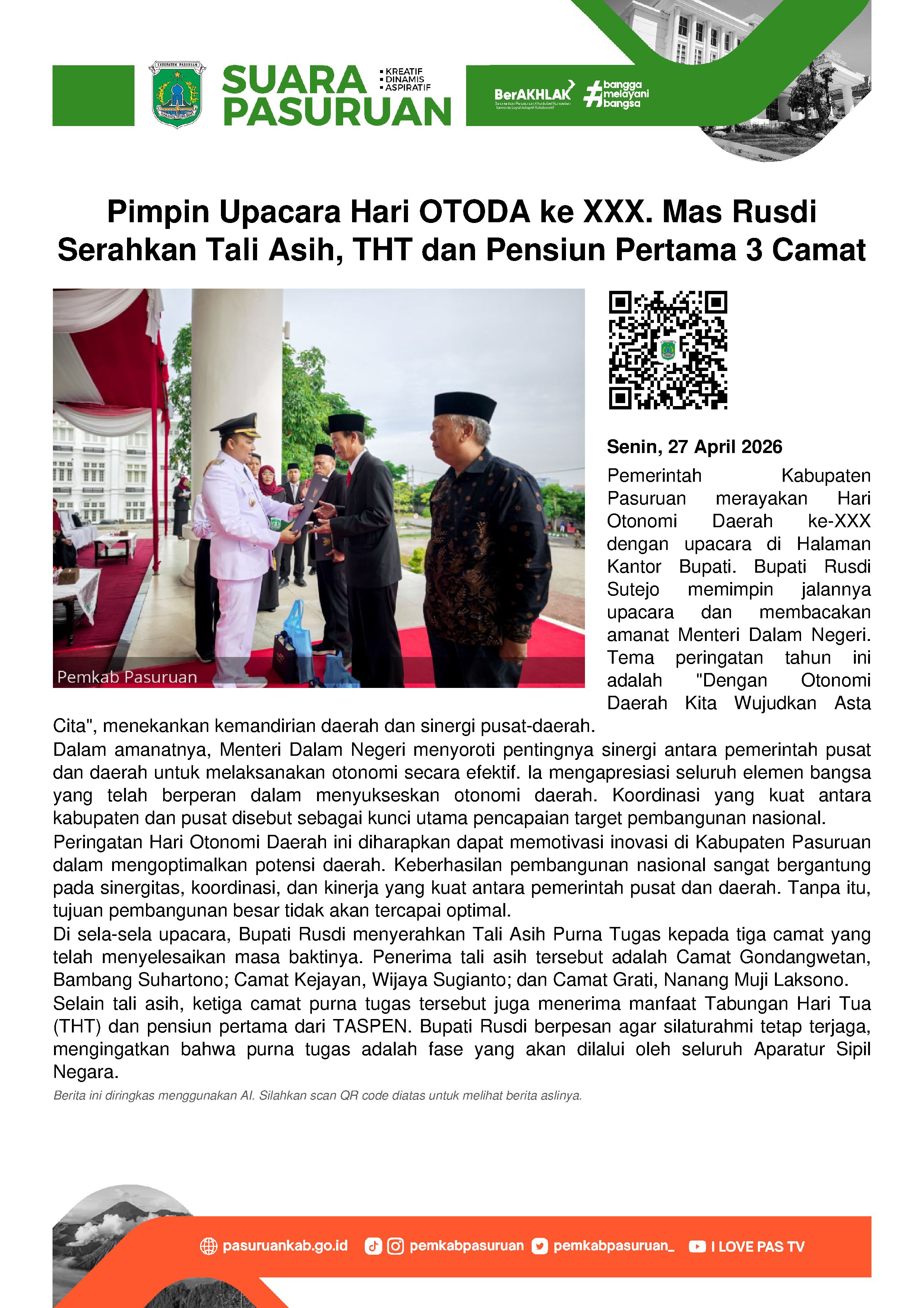Pemerintah Kabupaten Pasuruan menggelar Upacara memperingati Hari Otonomi Daerah (OTODA) ke XXX, Senin (27/4/2026) pagi.