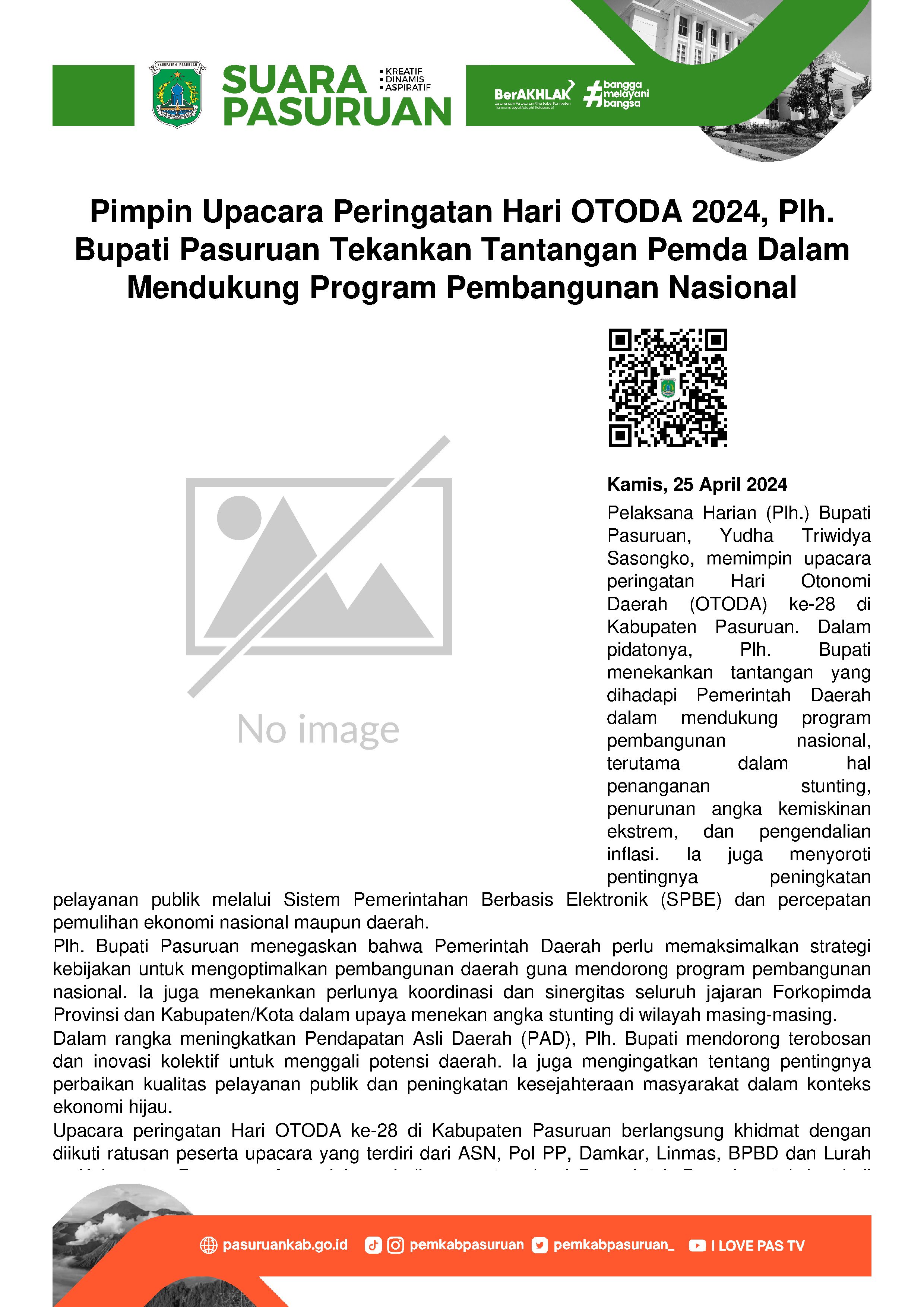 Selain memberikan dampak positif terhadap kondisi sosial ekonomi masyarakat, dalam perjalanannya, implementasi Otonomi Daerah (OTODA) masih menyisakan banyak pekerjaan rumah. Oleh karenanya, Pemerintah Daerah berkewajiban menyikapinya dengan mengurai hambatan yang masih menjadi kendala pelaksanaannya di lapangan. Pernyataan itu diungkapkan oleh Pelaksana Harian (Plh.) Bupati Pasuruan, Yudha Triwidya Sasongko pada saat memimpin upacara peringatan Hari Otonomi Daerah (OTODA) ke-28 di lingkungan Pemerintah Kabupaten Pasuruan.