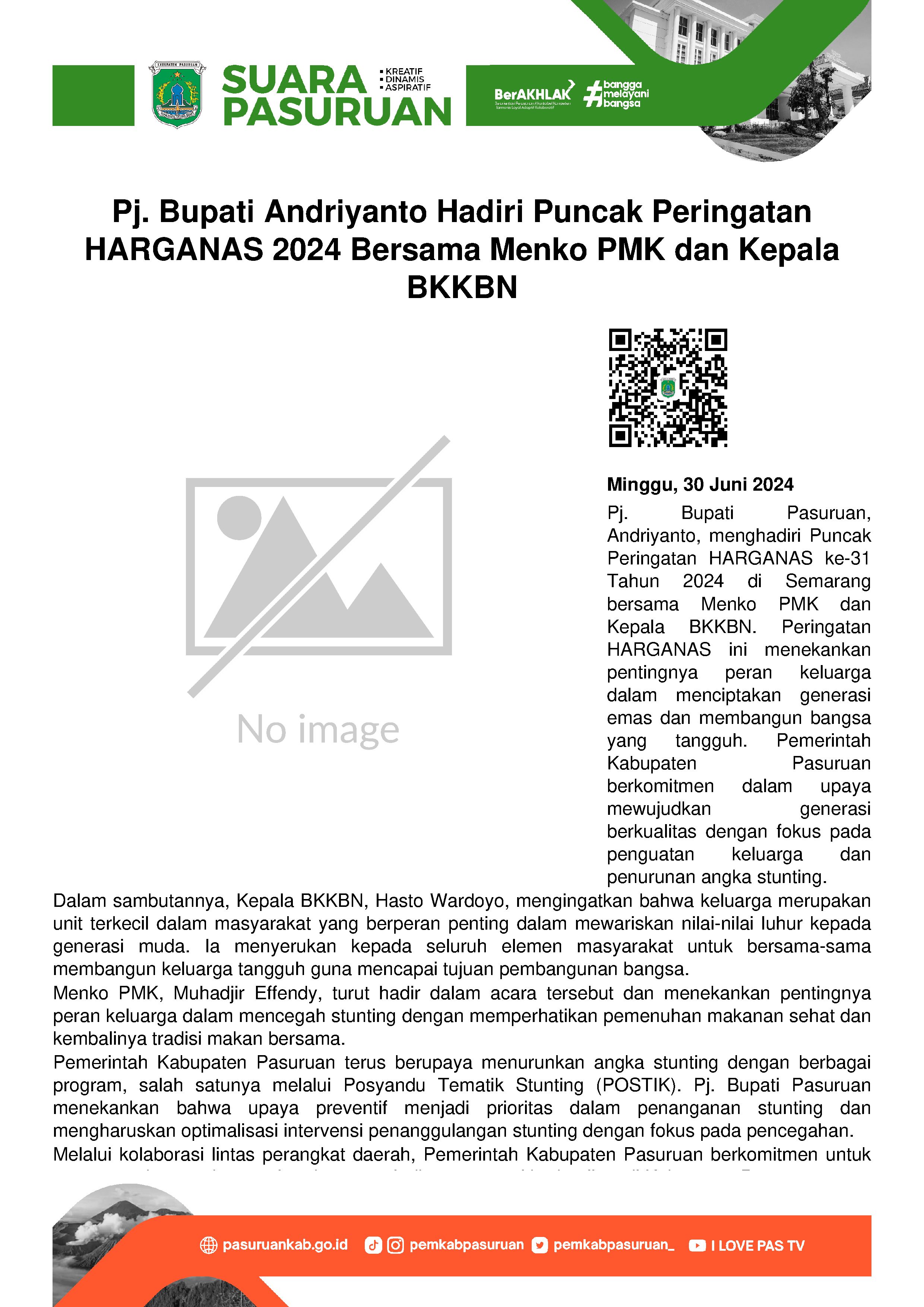 Berpartisipasi aktif dalam Puncak Peringatan Hari Keluarga Nasional (HARGANAS) ke-31 Tahun 2024 yang digelar di Lapangan Pancasila, Simpang Lima, Kota Semarang, Provinsi Jawa Tengah diantara wujud komitmennya. Hadir dalam kegiatan, Penjabat (Pj.) Bupati Pasuruan, Andriyanto bersama Kepala Dinas Pemberdayaan Perempuan Perlindungan Anak Pengendalian Penduduk dan Keluarga Berencana (DP3AP2KB) Kabupaten Pasuruan, Agus Masjhady. Berikut diikuti oleh beberapa Kepala Perangkat Daerah terkait lainnya.
