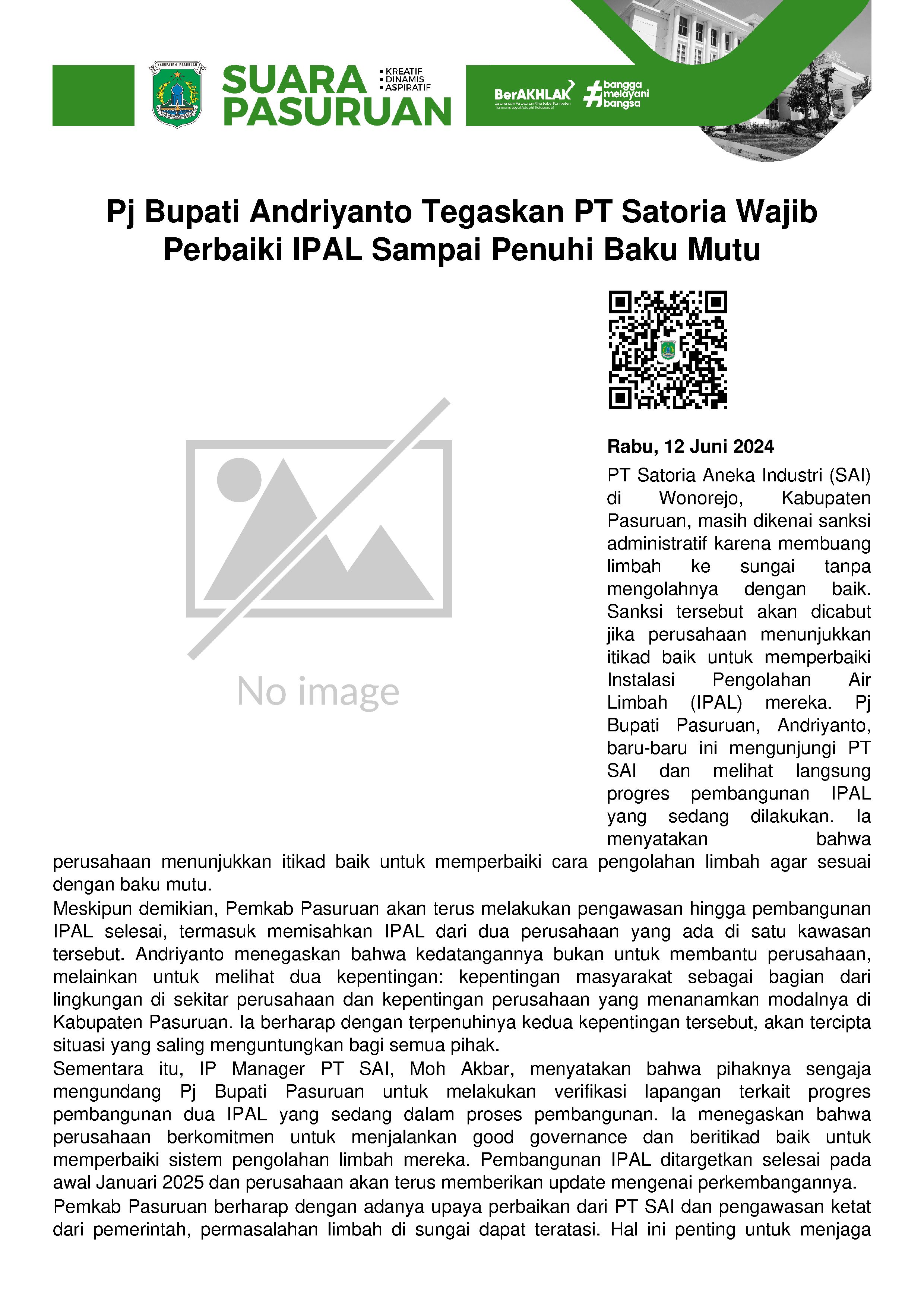 Hingga kini, sanksi administratif terhadap PT. SAI (Satoria Aneka Industri) di Wonorejo, Kabupaten Pasuruan masih berlaku.
