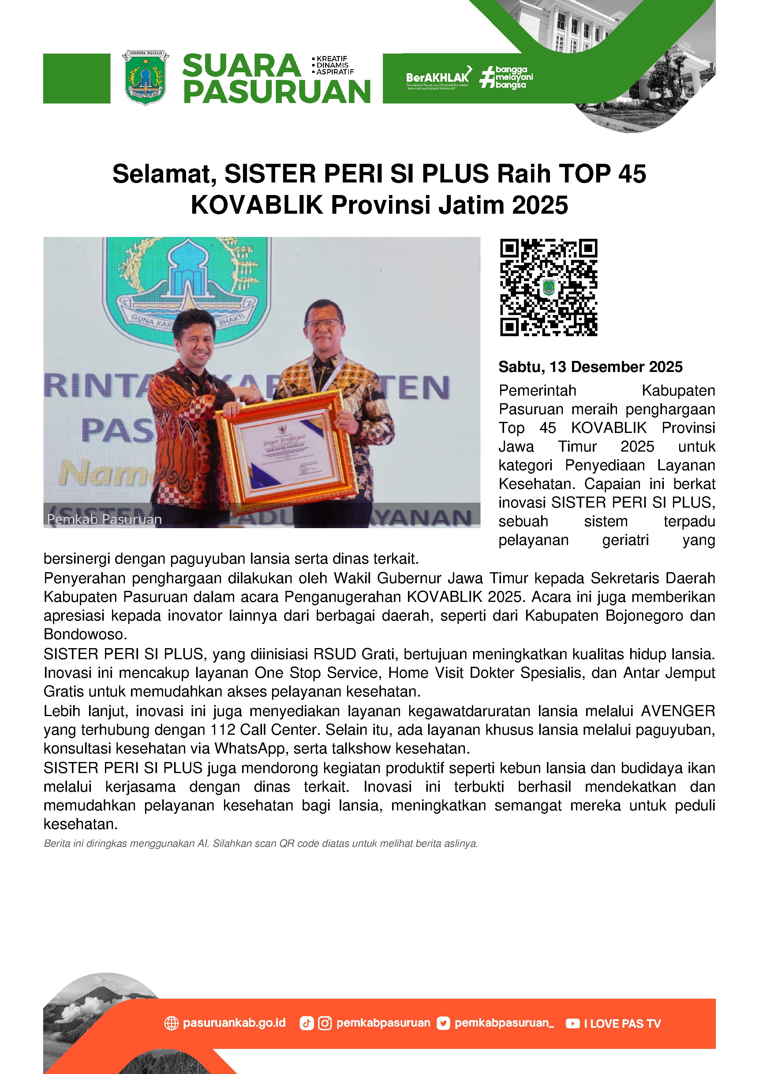 Masih di momen yang sama, Pj. Bupati Andriyanto menambahkan, kesuksesan terselenggaranya kegiatan menjadi kebanggaan tersendiri bagi Pemerintah Kabupaten Pasuruan. Sekaligus sebagai motivasi dan spirit terbarukan ke depannya agar semakin sukses pelaksanaannya. Sehingga akan memberikan banyak benefit bagi seluruh masyarakat Kabupaten Pasuruan, terutama warga Kecamatan Tosari.