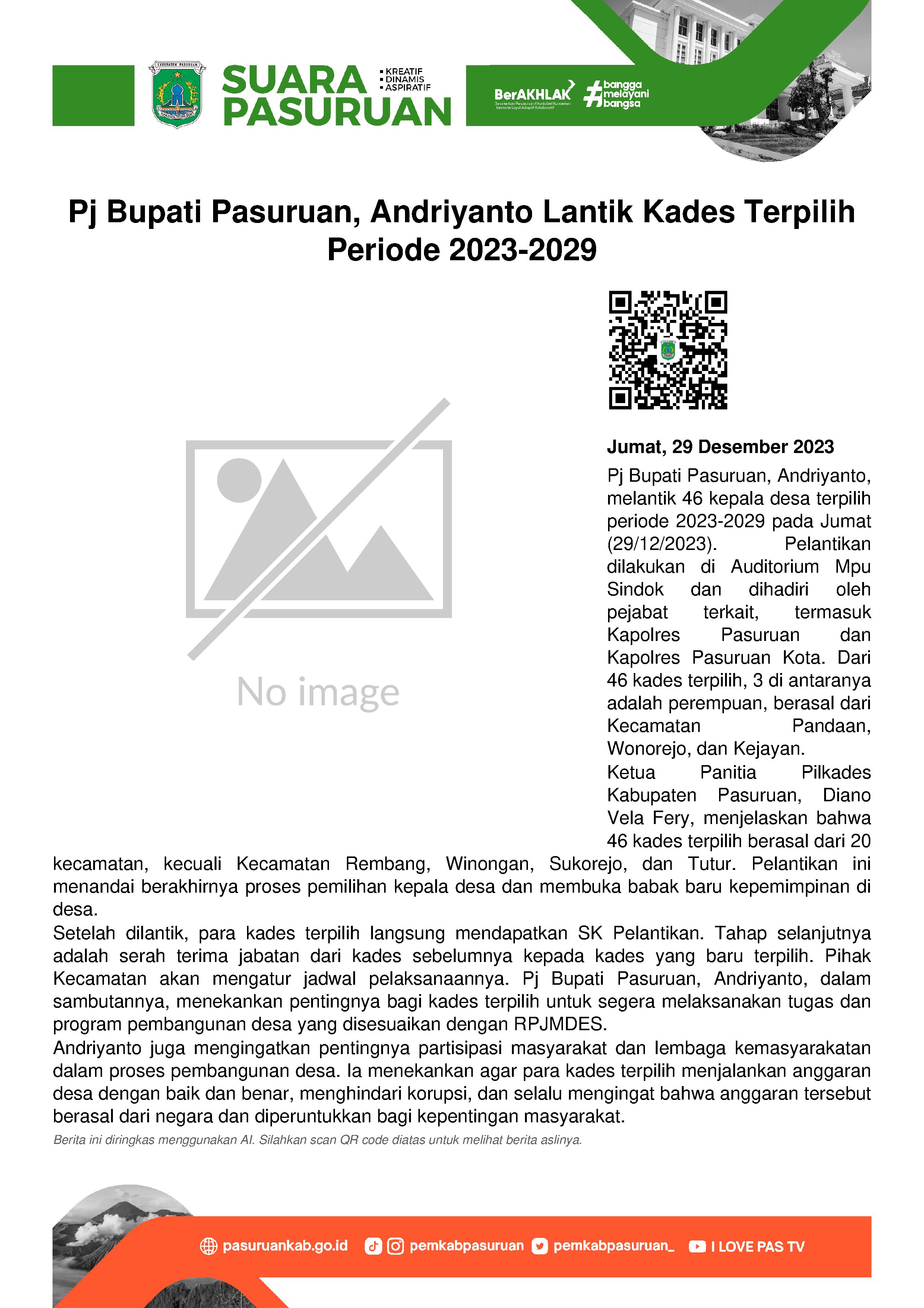 Ketua Panitia Pilkades Kabupaten Pasuruan, Diano Vela Fery menjelaskan, 46 kades terpilih berasal dari 20 kecamatan, minus Kecamatan Rembang, Winongan, Sukorejo dan Tutur.