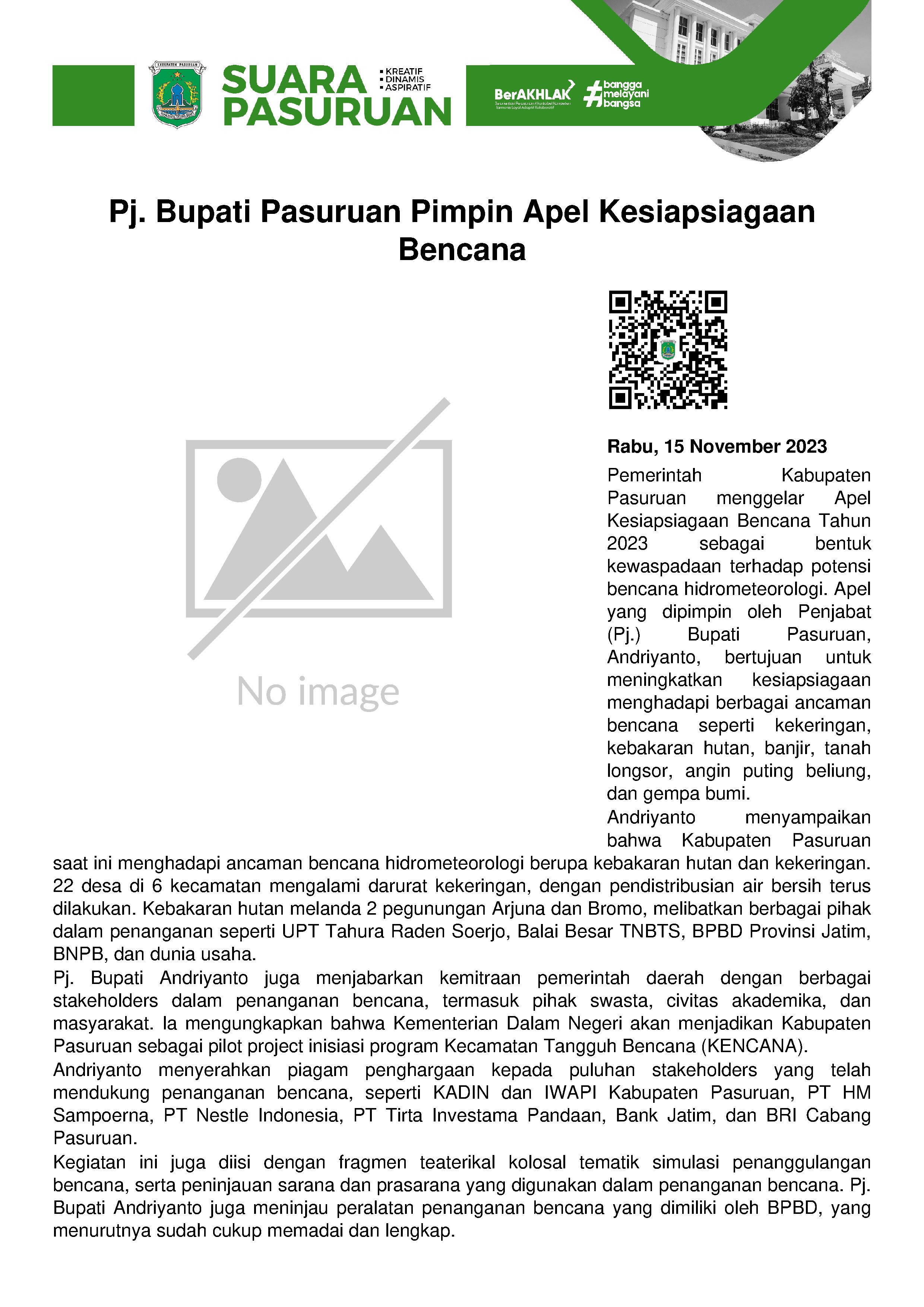 Di hadapan Sekretaris Daerah Yudha Triwidya Sasongko, Kepala BPBD Kabupaten Pasuruan Sugeng Hariyadi dan seluruh peserta Apel Kesiapsiagaan Bencana, Pj. Bupati Andriyanto menjabarkan kemitraan Pemerintah Kabupaten Pasuruan bersama seluruh stakeholders dalam penanganan bencana. Baik dari pihak swasta, civitas akademika maupun unsur masyarakat.