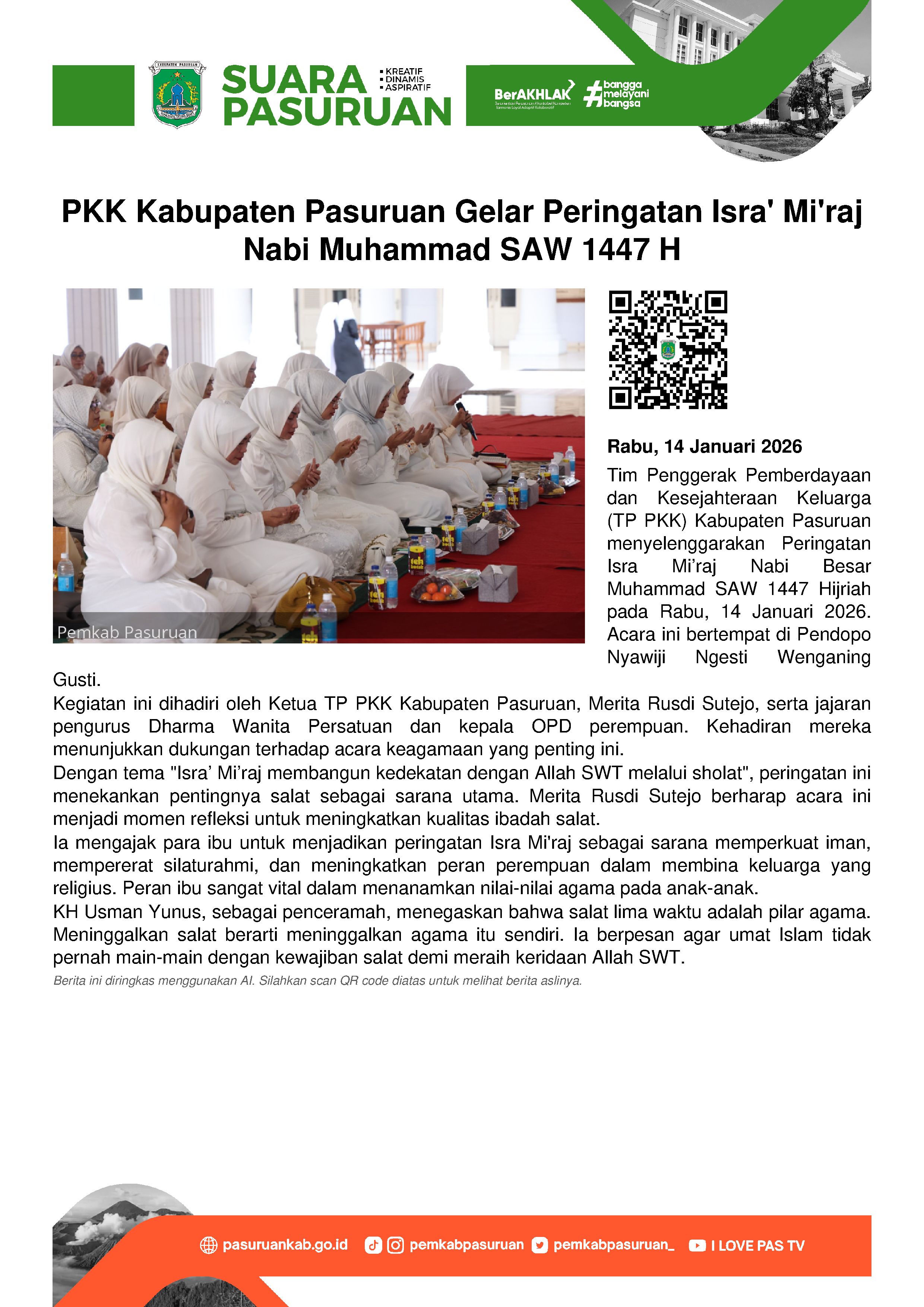 Tim Penggerak Pemberdayaan dan Kesejahteraan Keluarga (TP PKK) Kabupaten Pasuruan menggelar Peringatan Isra Mi’raj Nabi Besar Muhammad SAW 1447 Hijriah, Rabu (14/1/2026).