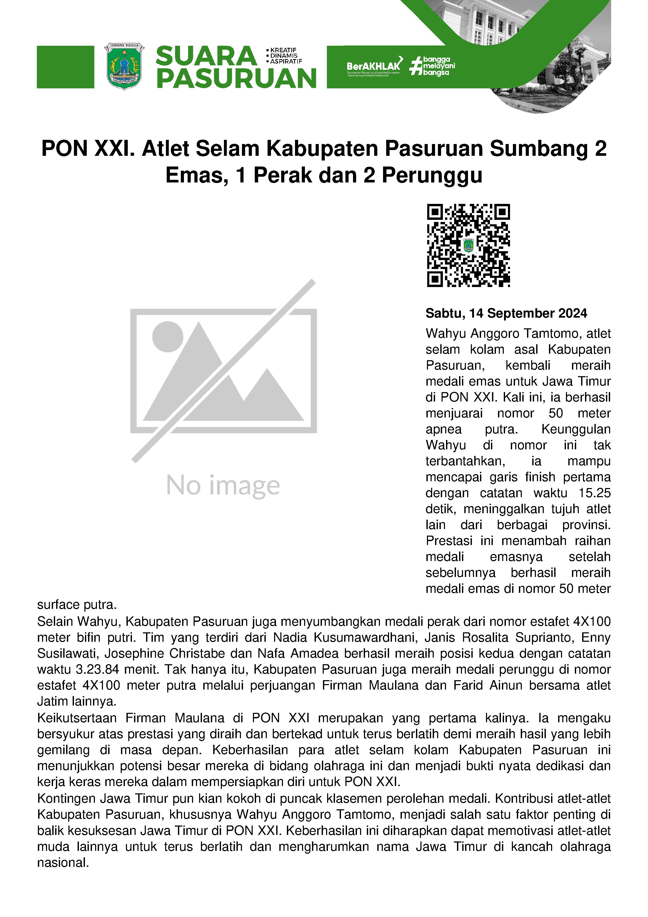 Setelah sukses di nomor 50 meter Surface Putra, Atlet Finswimming (selam kolam) Kabupaten Pasuruan, Wahyu Anggoro Tamtomo kembali mempersembahkan medali emas bagi kontingen Jawa Timur pada Pekan Olahraga Nasional (PON) XXI.