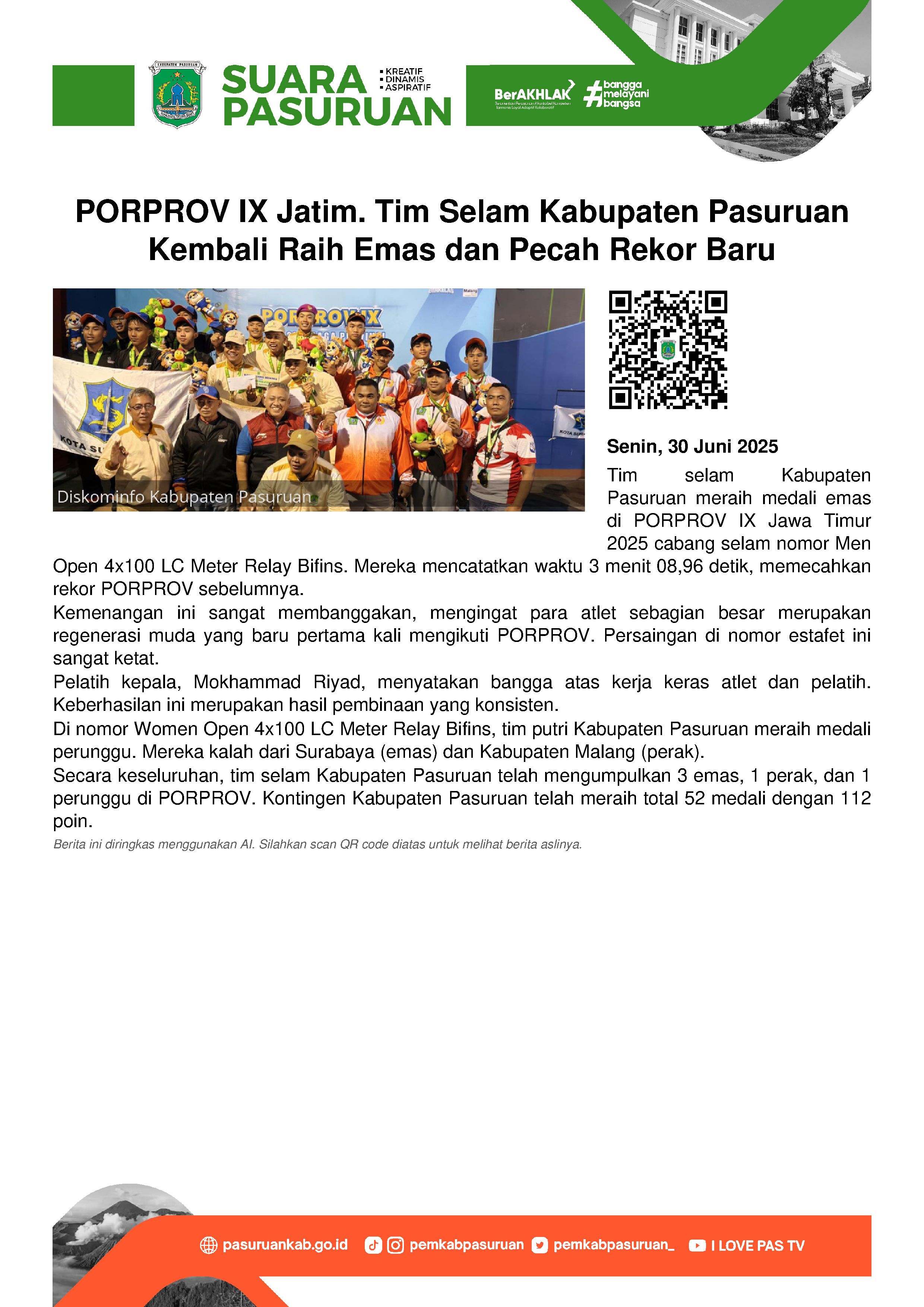 Tim selam Kabupaten Pasuruan kembali menambah deretan medali dalam ajang Pekan Olahraga Provinsi (PORPROV) Jawa Timur ke-IX tahun 2025 yang dilaksanakan di Kolam Renang Gajayana, Kota Malang, Minggu (29/6/2025) kemarin.