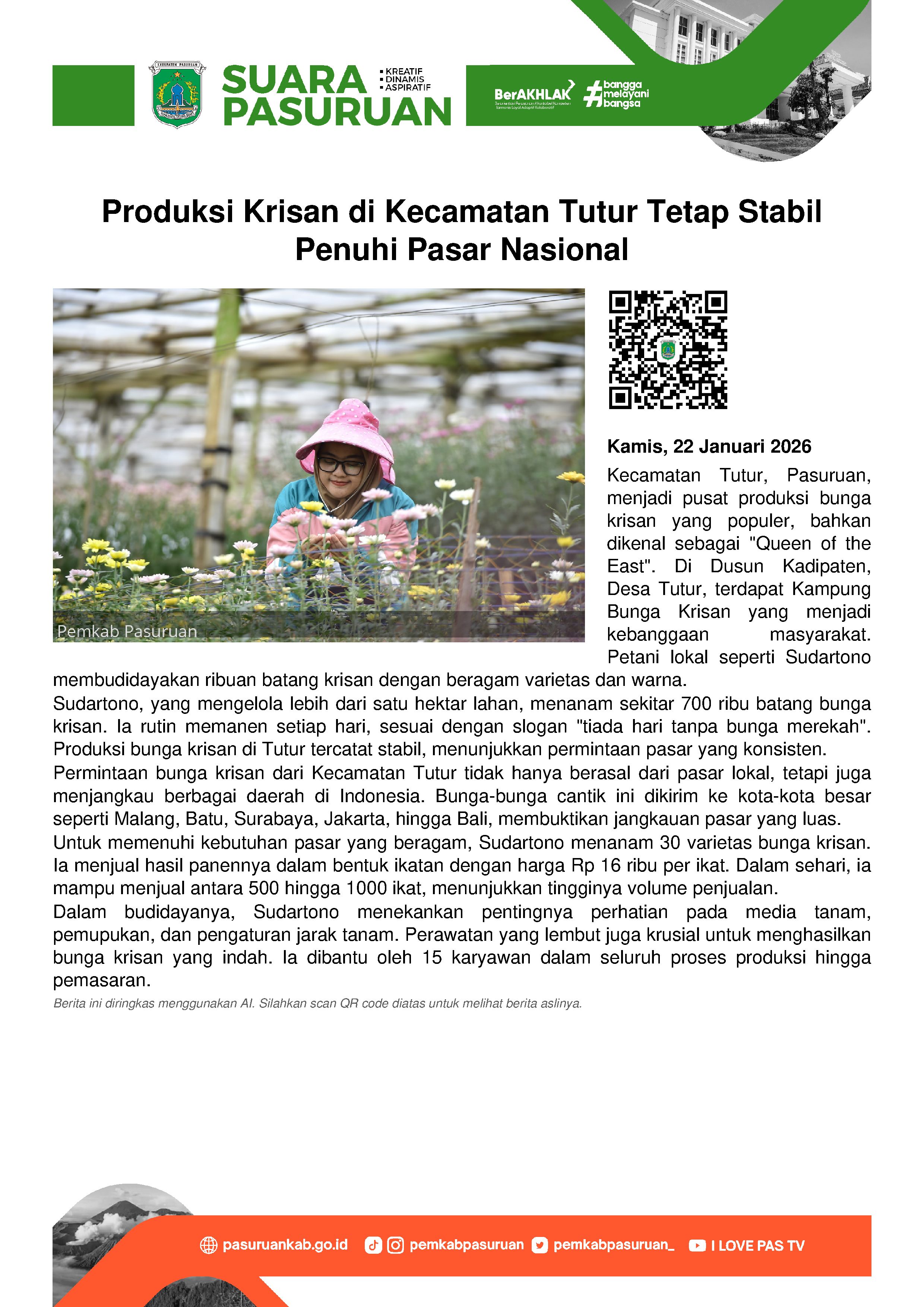 Dia adalah bunga krisan. Bunga ini menjadi kebanggaan masyarakat di Kecamatan Tutur, Kabupaten Pasuruan. Saking cintanya sampai-sampai ada Kampung Bunga Krisan di Dusun Kadipaten, Desa Tutur.