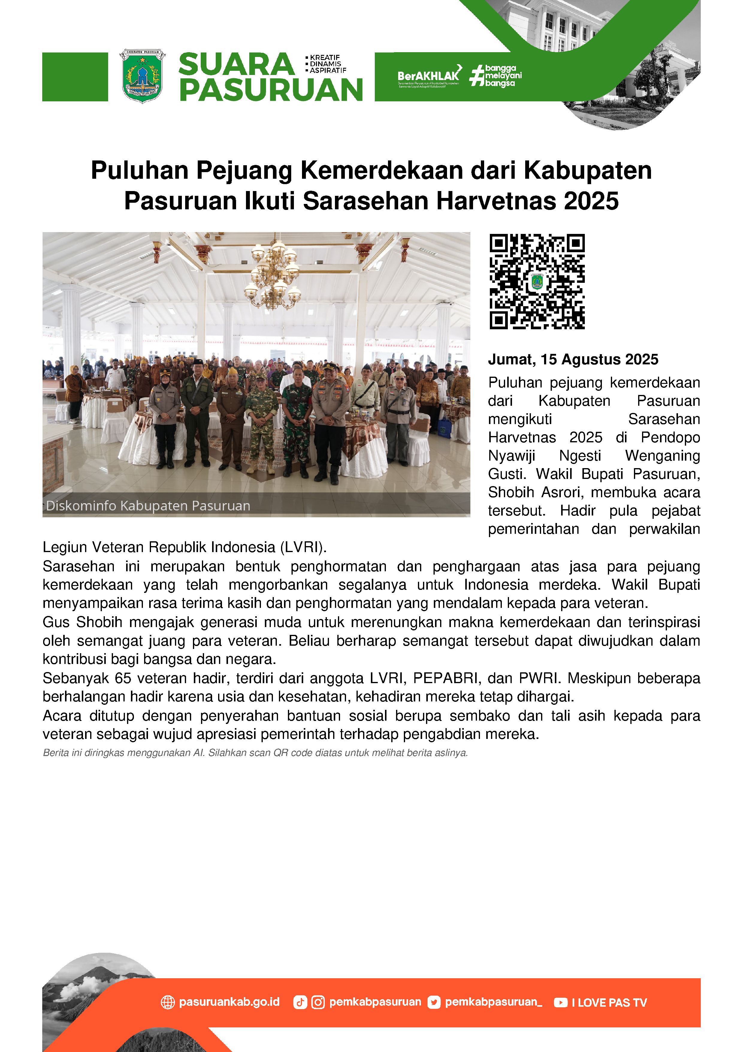 Di hadapan para pejuang kemerdekaan, Gus Shobih - sapaan akrab Wakil Bupati Pasuruan ini sangat berterima kasih. Sebab para generasi penerus bangsa yang hadir di Pendopo Bupati ini dapat mengambil banyak ilmu dan cerita perjuangan dari para veteran.
