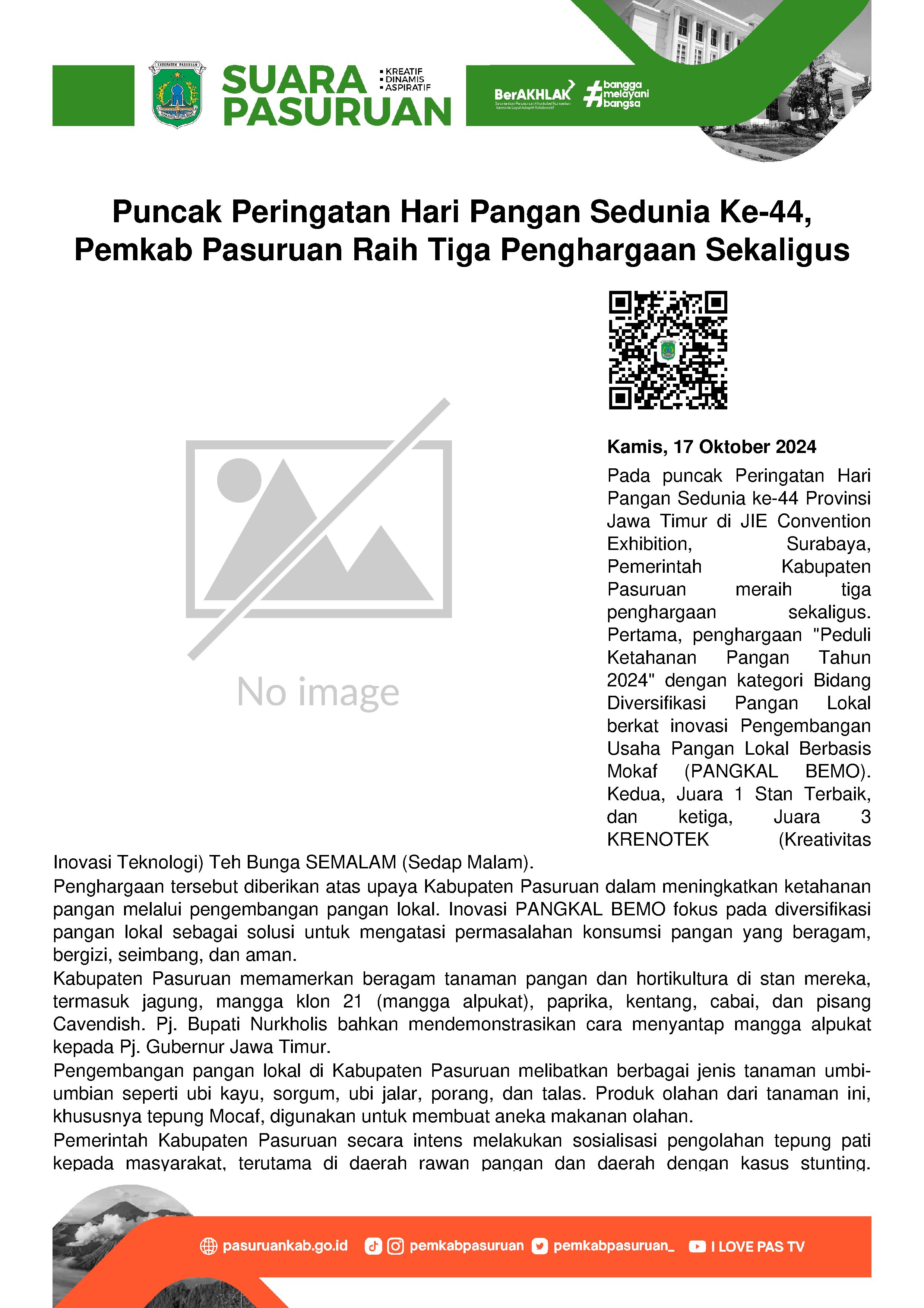 Dalam satu hari, Pemerintah Kabupaten Pasuruan meraih tiga penghargaan sekaligus dari Pemerintah Provinsi Jawa Timur. Apresiasi diberikan dalam acara Puncak Peringatan Hari Pangan Sedunia (HPS) ke- 44 Provinsi Jawa Timur Tahun 2024 di Jatim International Expo (JIE) Convention Exhibition, Kota Surabaya.