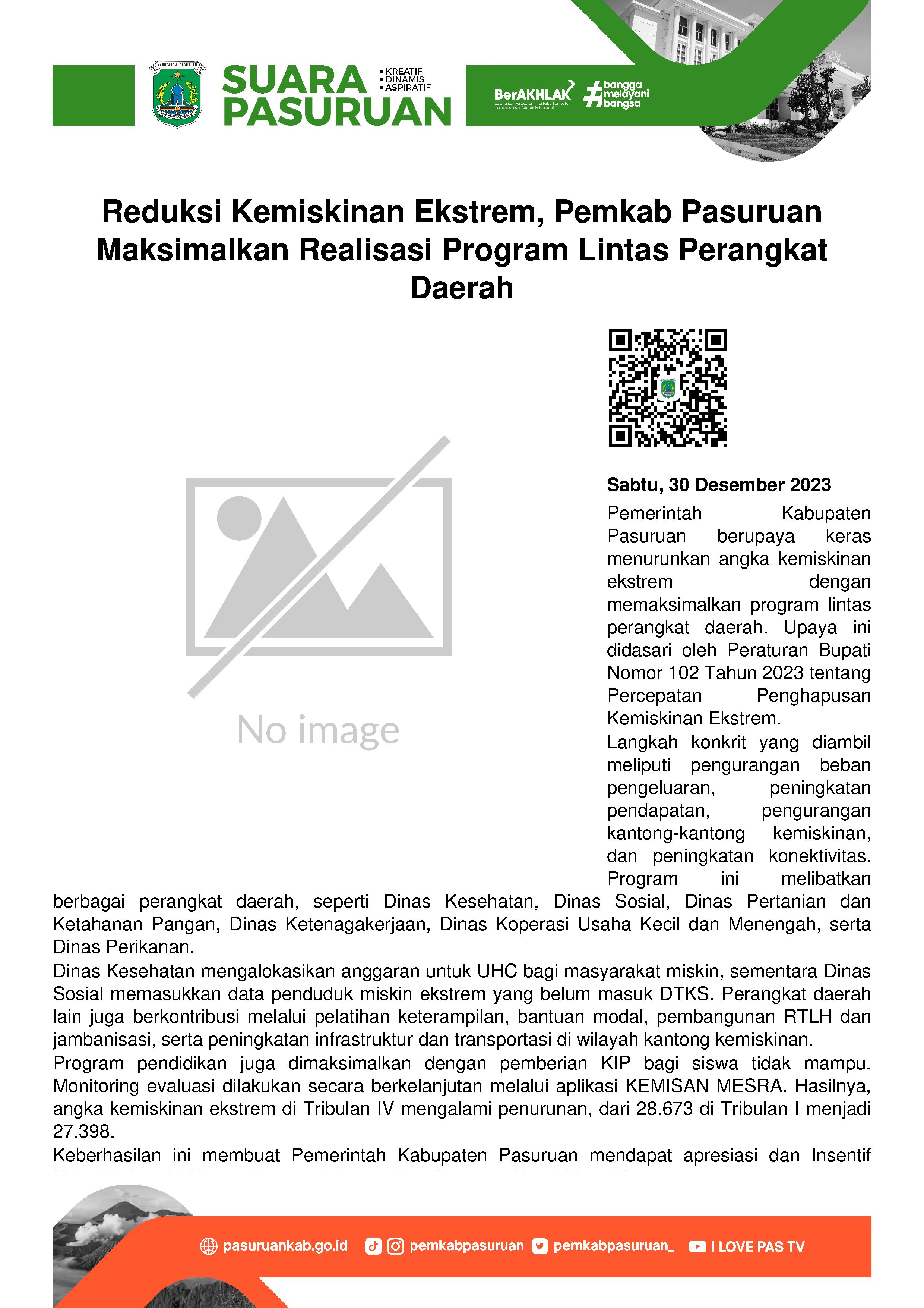 Untuk menurunkan angka kemiskinan ekstrem, Pemerintah Kabupaten Pasuruan kian intens memaksimalkan realisasi beberapa program kegiatan yang dilaksanakan oleh Perangkat Daerah terkait. Hal itu mengacu kepada regulasi payung hukum yang telah ditetapkan oleh Kepala Daerah melalui Peraturan Bupati Nomor 102 Tahun 2023 tentang Percepatan Penghapusan Kemiskinan Ekstrem.