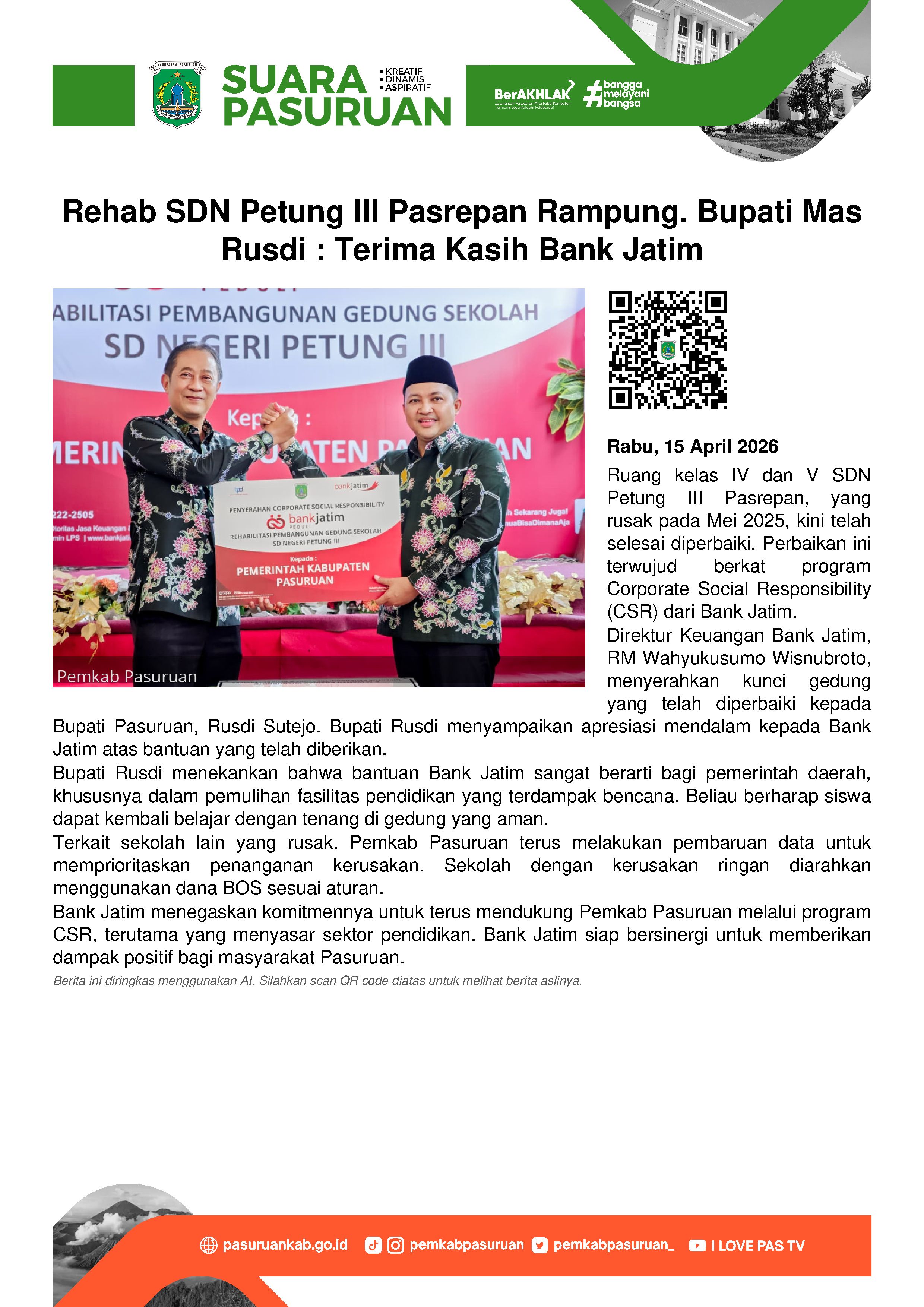 Melalui Cooperate Social Responsilibilty (CSR) Bank Jatim, dua ruangan kelas tersebut akhirnya selesai diperbaiki dan secara resmi diserahkan Direktur Keuangan, Treasury & Global Services Bank Jatim, RM Wahyukusumo Wisnubroto kepada Bupati Pasuruan, Rusdi Sutejo, Rabu (15/4/2026).