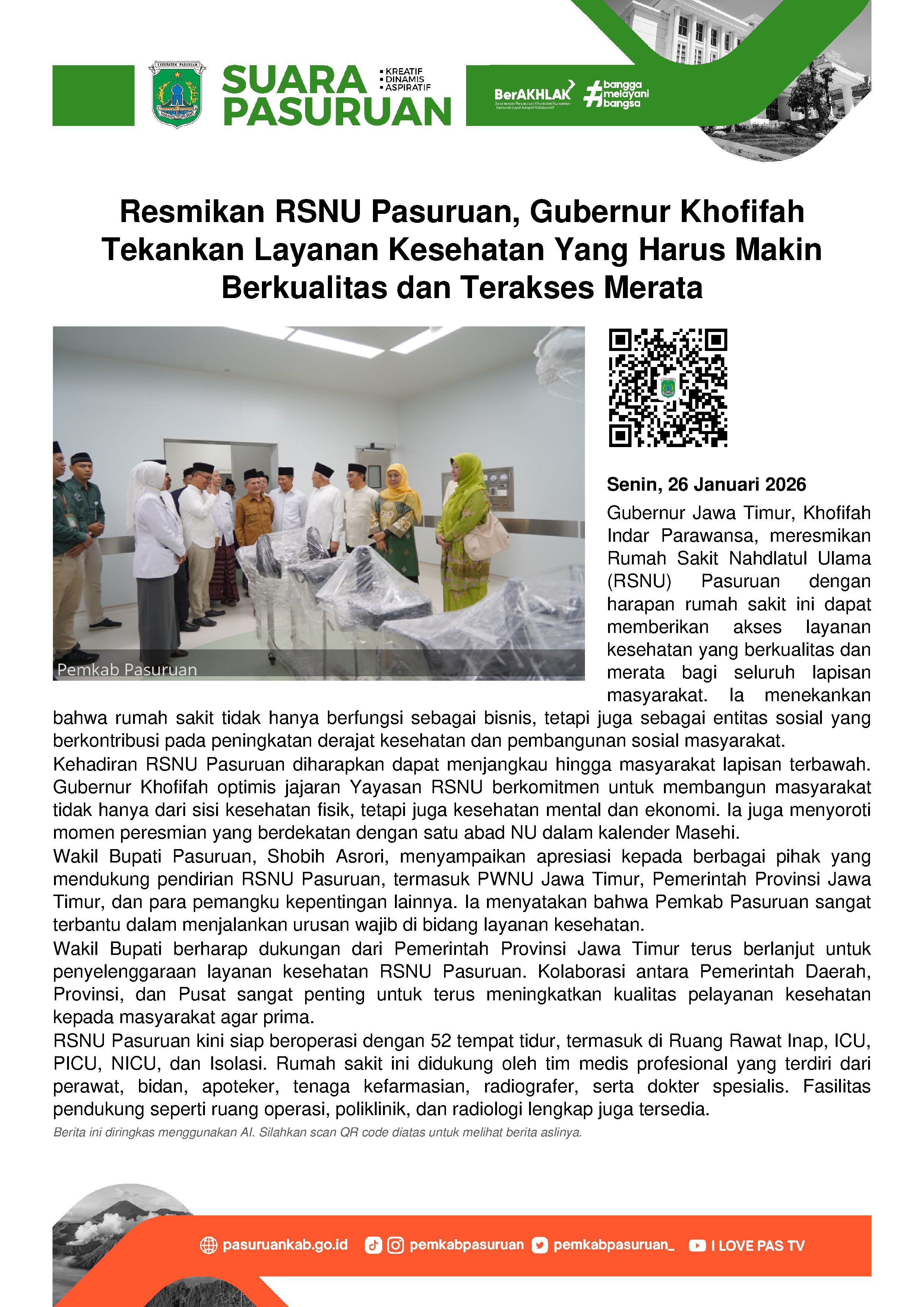 “Selamat dan sukses atas diresmikannya RSNU di Kabupaten Pasuruan. Harapannya ke depannya layanan kesehatan semakin berkualitas dan makin merata. Juga bisa terjangkau oleh seluruh lapisan masyarakat hingga lapisan paling bawah,” ucapnya pada hari Senin (26/1/2026).