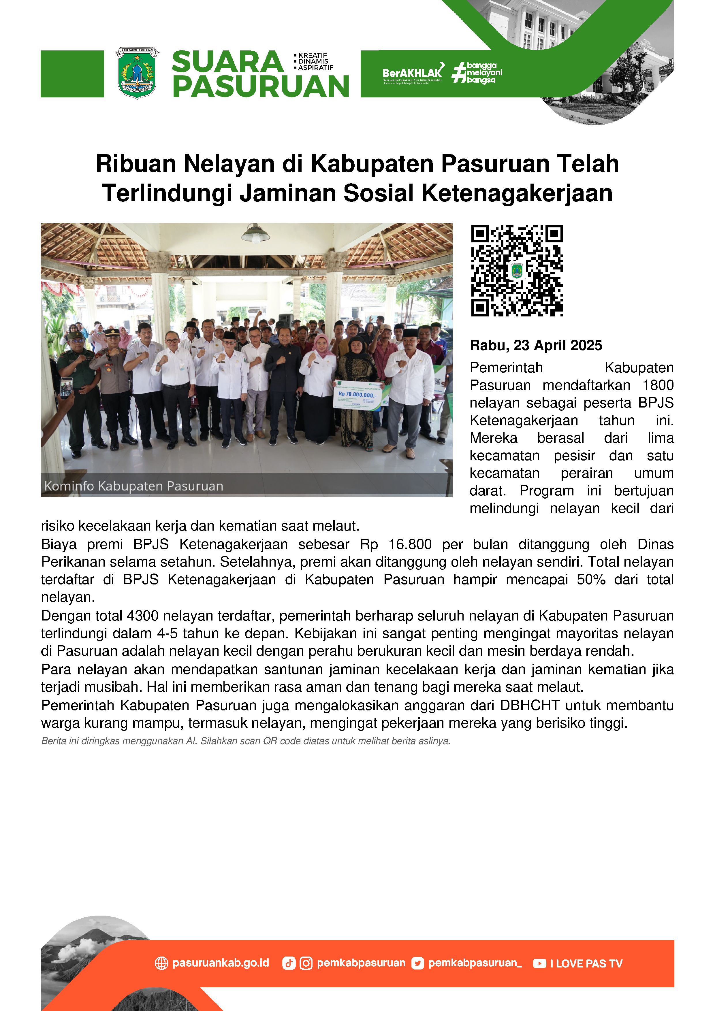 Tahun ini, Pemerintah Kabupaten Pasuruan mendaftarkan ribuan nelayan sebagai peserta BPJS Ketenagakerjaan.
