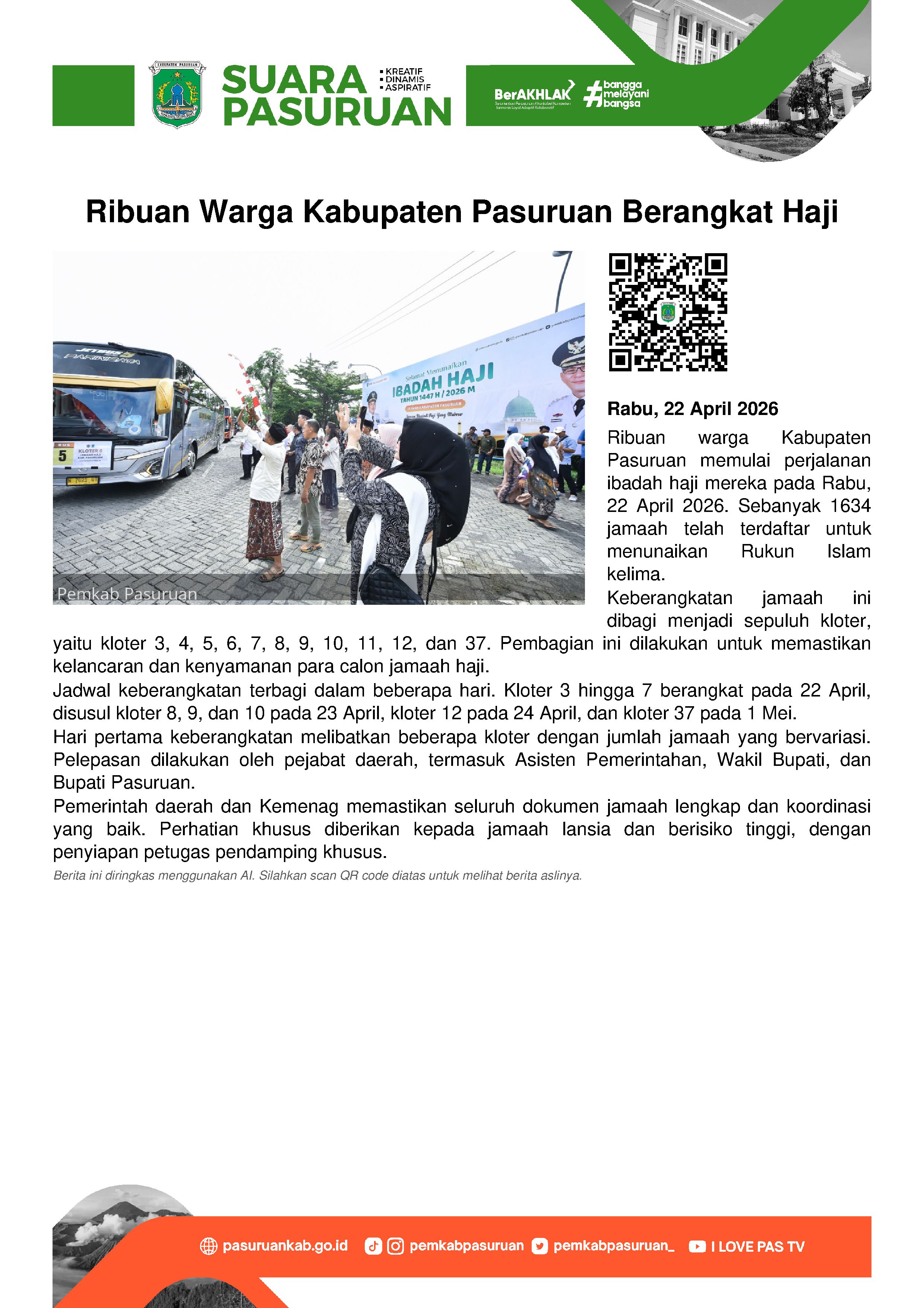 Ribuan warga Kabupaten Pasuruan, berangkat haji, Rabu (22/4/2026).