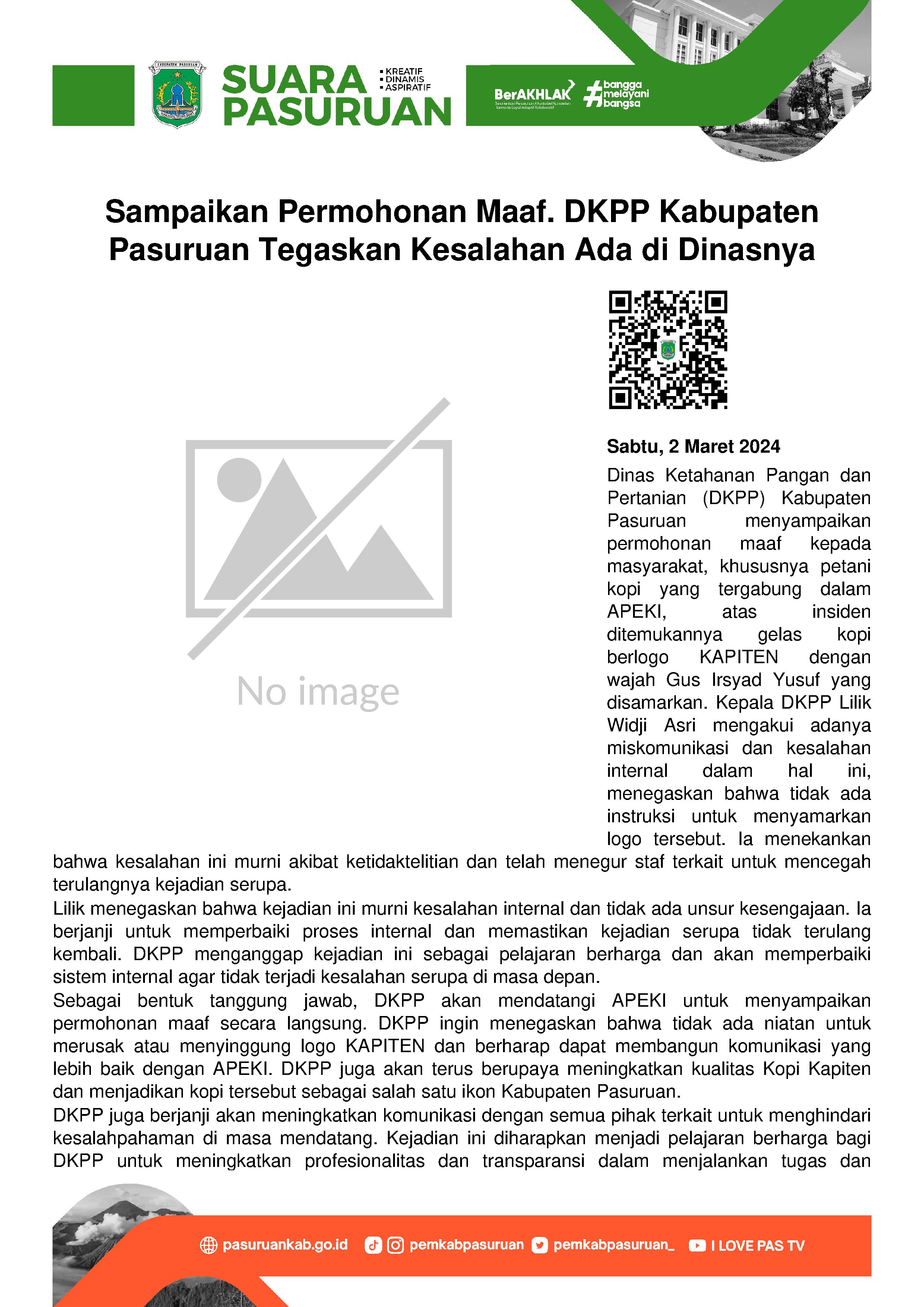 Dinas Ketahanan Pangan dan Pertanian (DKPP) Kabupaten Pasuruan menyampaikan permohonan maaf secara terbuka usai ditemukannya gelas kopi berlogo KAPITEN (Kopi Khas Kabupaten Pasuruan bergambar wajah Gus Irsyad Yusuf yang disamarkan.