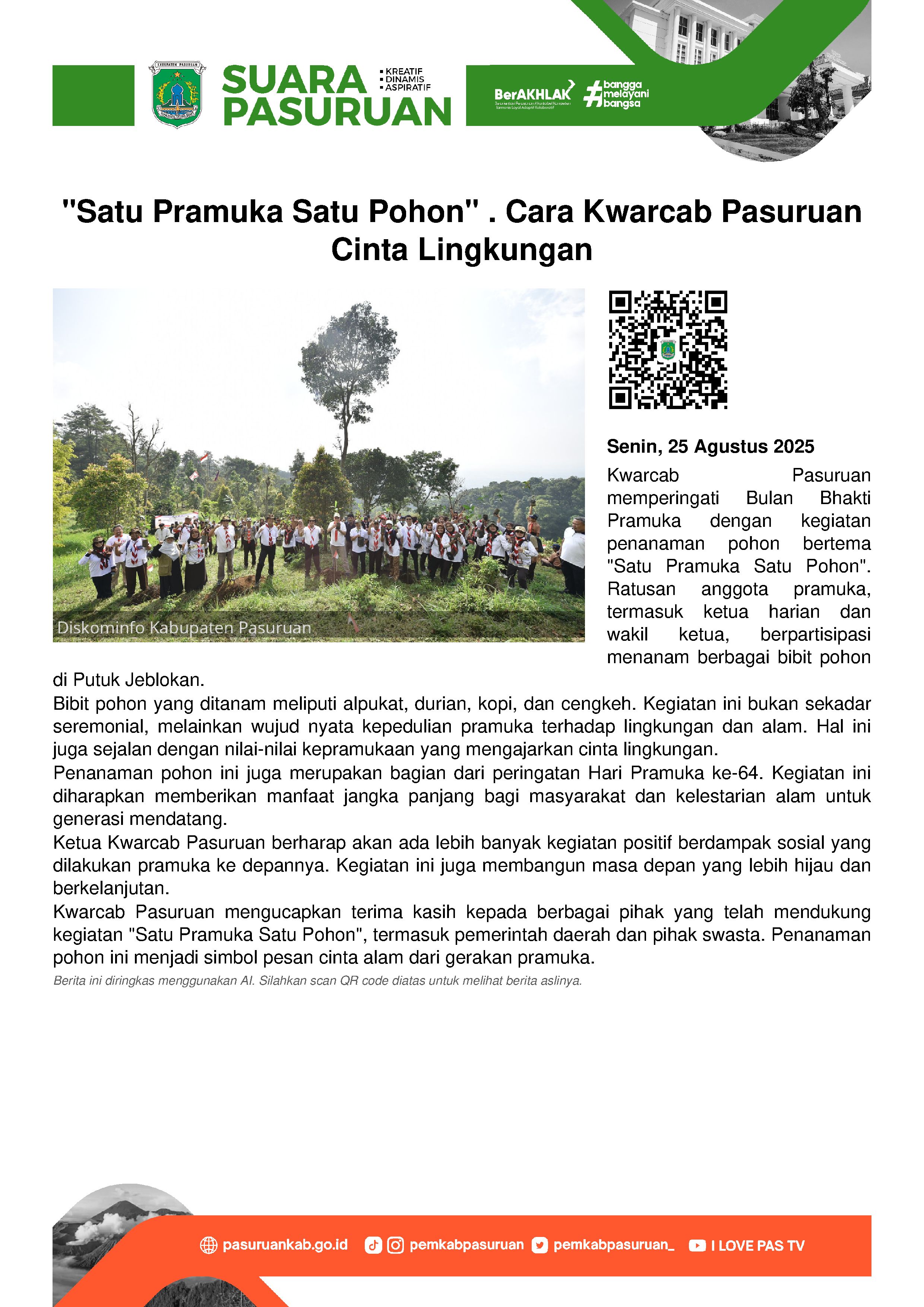 "Semoga di tahun tahun ke depan, semakin banyak kegiatan yang diisi oleh pramuka. Sebab melalui langkah kecil menanam pohon, Gerakan Pramuka Kwartir Cabang Pasuruan memberikan teladan nyata dalam membangun masa depan yang lebih hijau, sehat, dan berkelanjutan," pungkasnya.