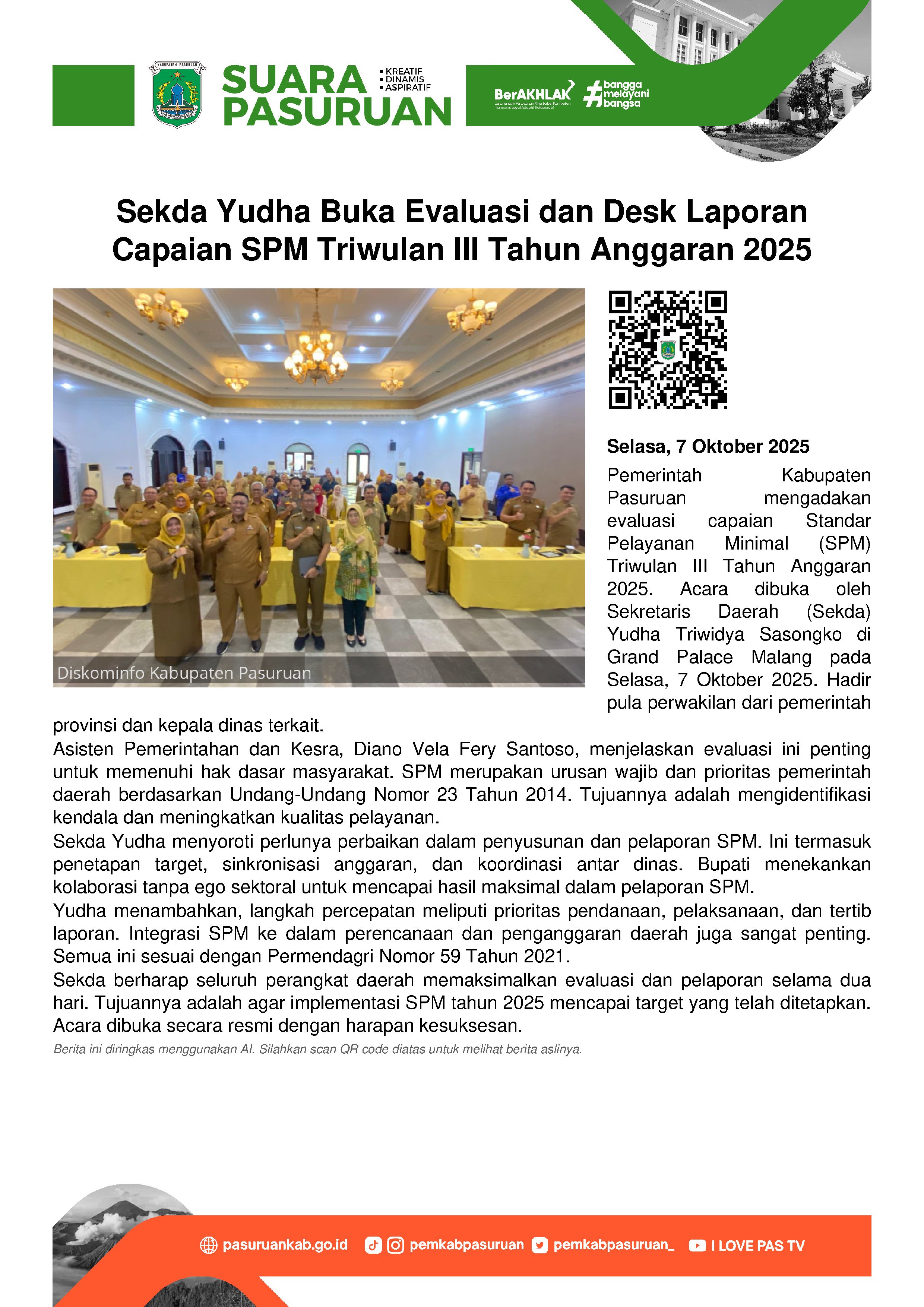 Pemerintah Kabupaten Pasuruan menggelar kegiatan Evaluasi dan Desk Laporan Capaian Standar Pelayanan Minimal (SPM) Triwulan III Tahun Anggaran 2025, Selasa (7/10/2025).