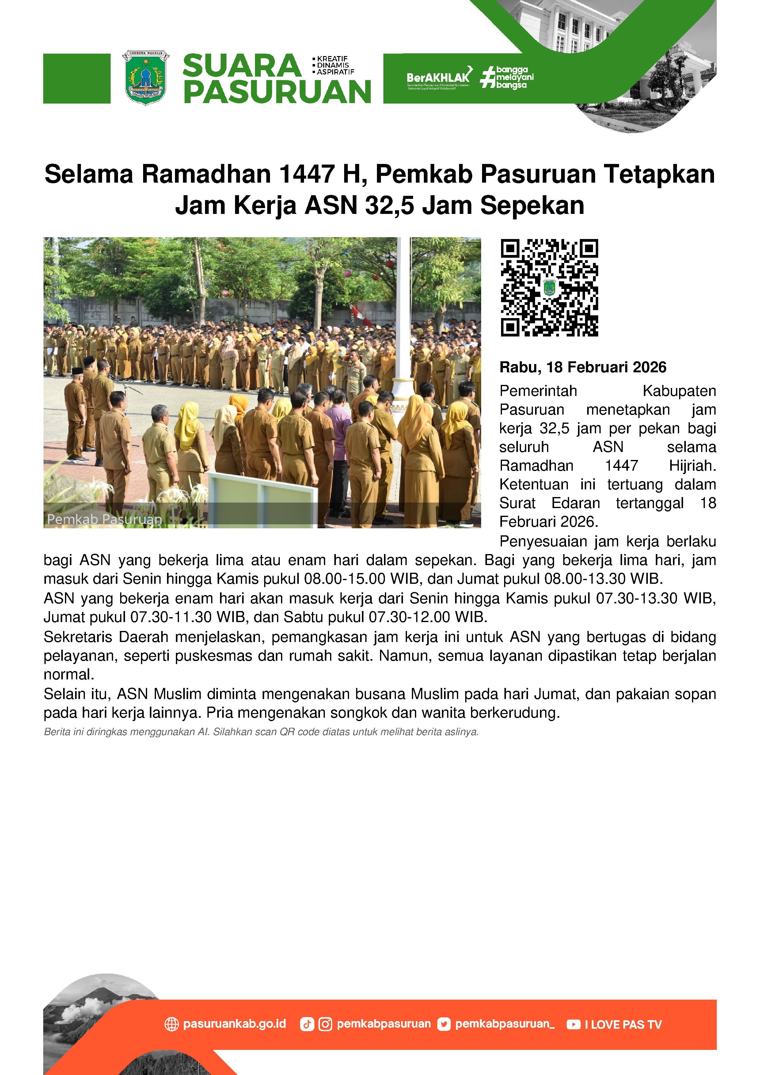 Sepanjang berlangsungnya bulan suci Ramadhan 1447 Hijriah,Pemerintah Kabupaten Pasuruan menetapkan jam kerja 32,5 jam atau 32 jam 30 menit bagi seluruh aparatur sipil negara (ASN) dalam satu pekan.