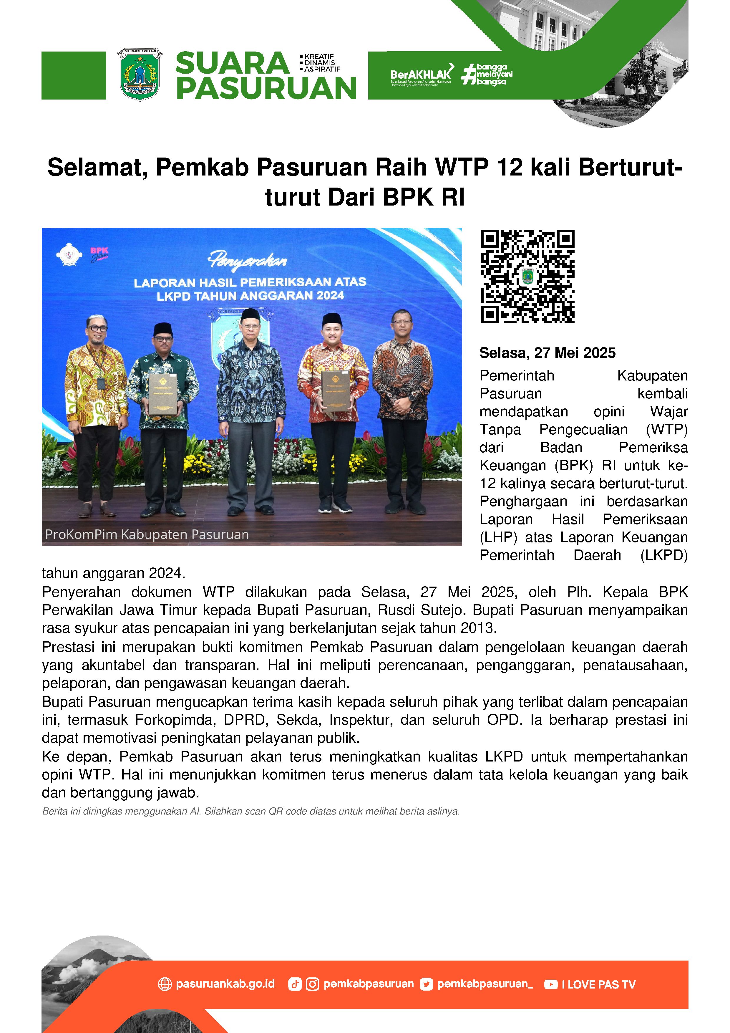 Pemerintah Kabupaten Pasuruan kembali meraih Opini WTP (Wajar Tanpa Pengecualian) dari Badan Pemeriksa Keuangan Republik Indonesia (BPK RI). Tahun ini, capaian yang ke-12 kalinya secara berturut-turut.