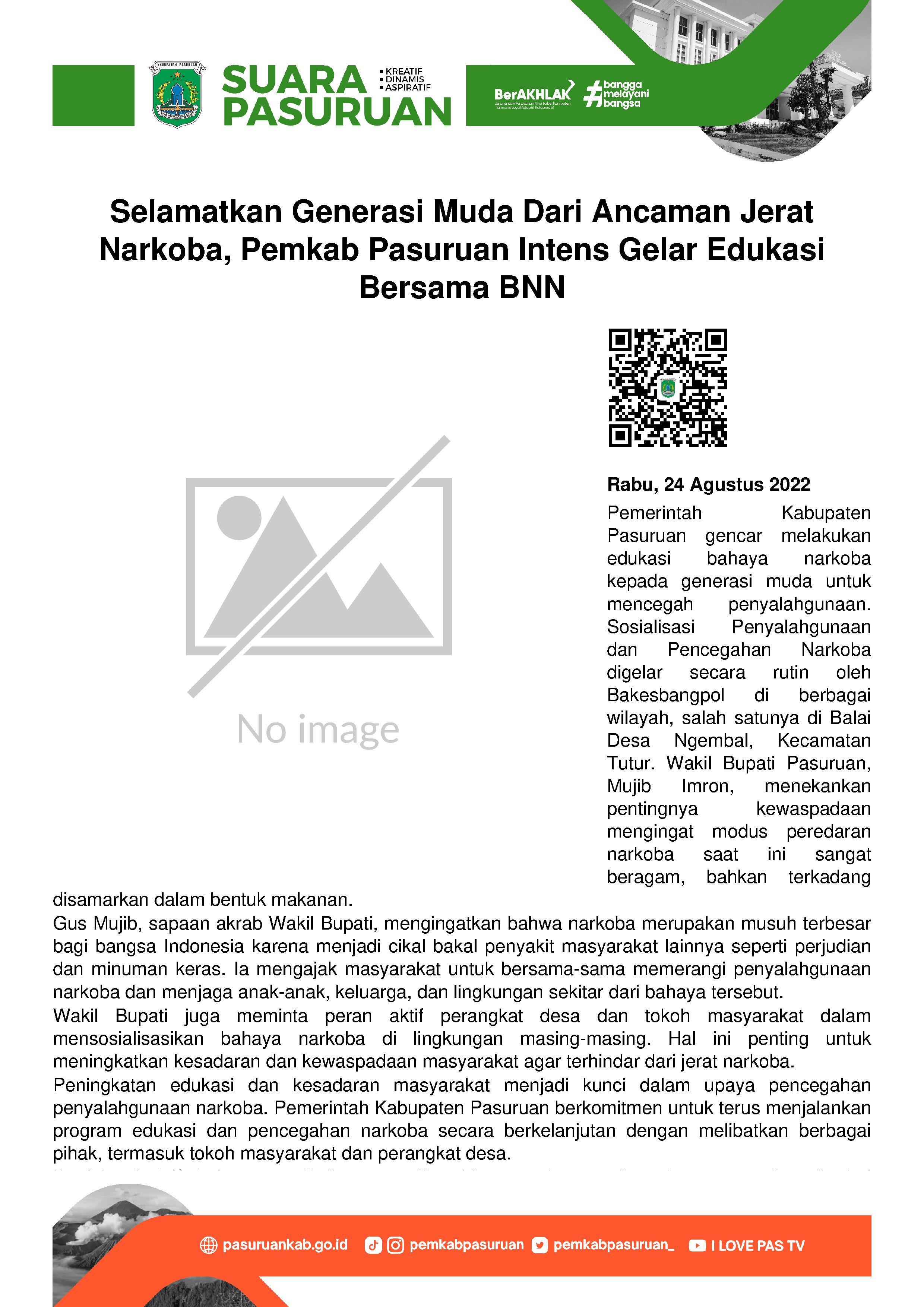 Sebagai bentuk kepedulian kepada generasi muda agar terbebas dari ancaman bahaya narkoba, Pemerintah Kabupaten Pasuruan semakin intens memberikan edukasi. Hal itu dilakukan melalui kegiatan Sosialisasi Penyalahgunaan dan Pencegahan Narkoba.