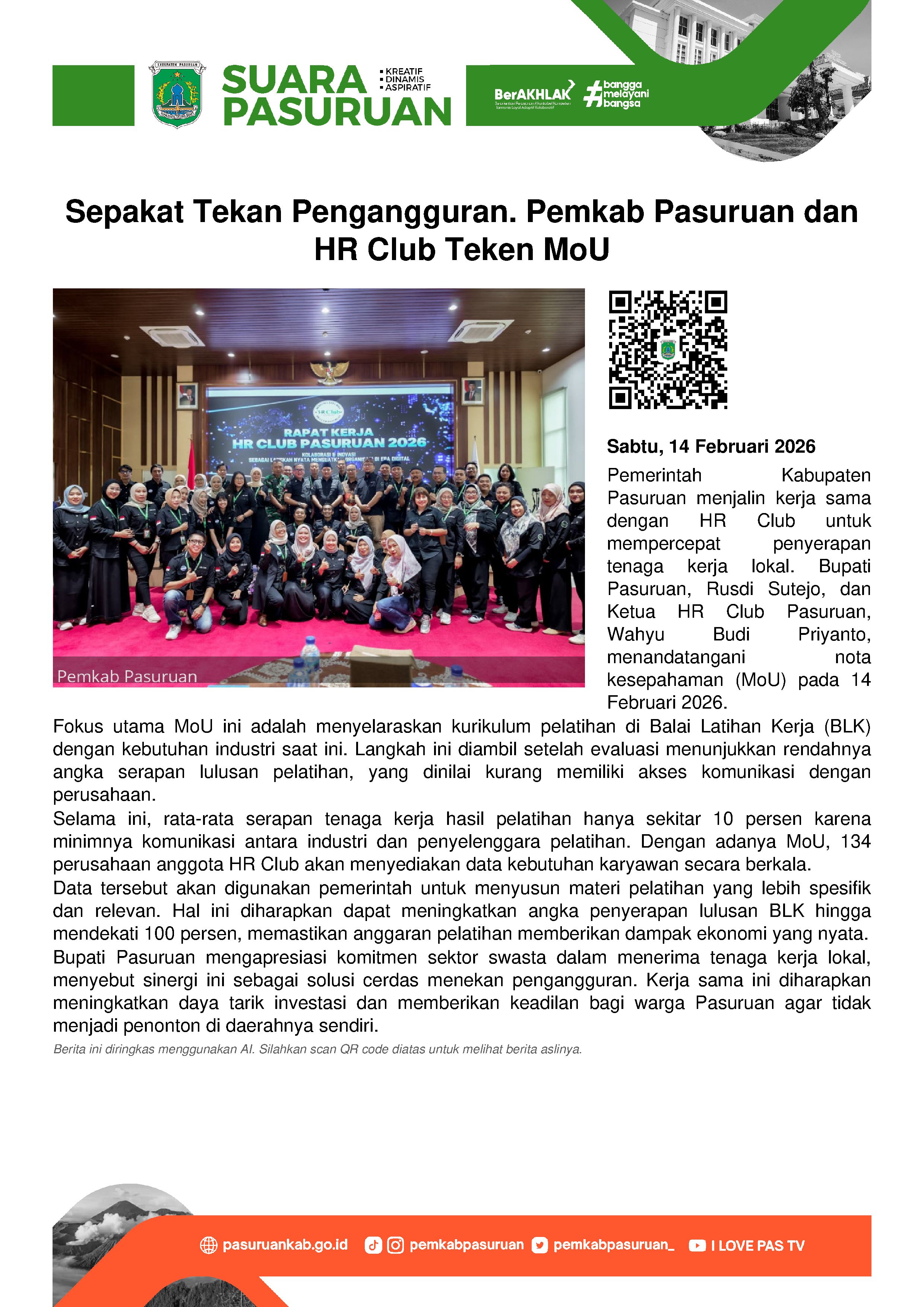 Pemerintah Kabupaten Pasuruan bersama Komunitas Pengelola Sumber Daya Manusia (HR Club) menggelar penandatanganan nota kesepahaman alias MoU, Sabtu (14/2/2026).