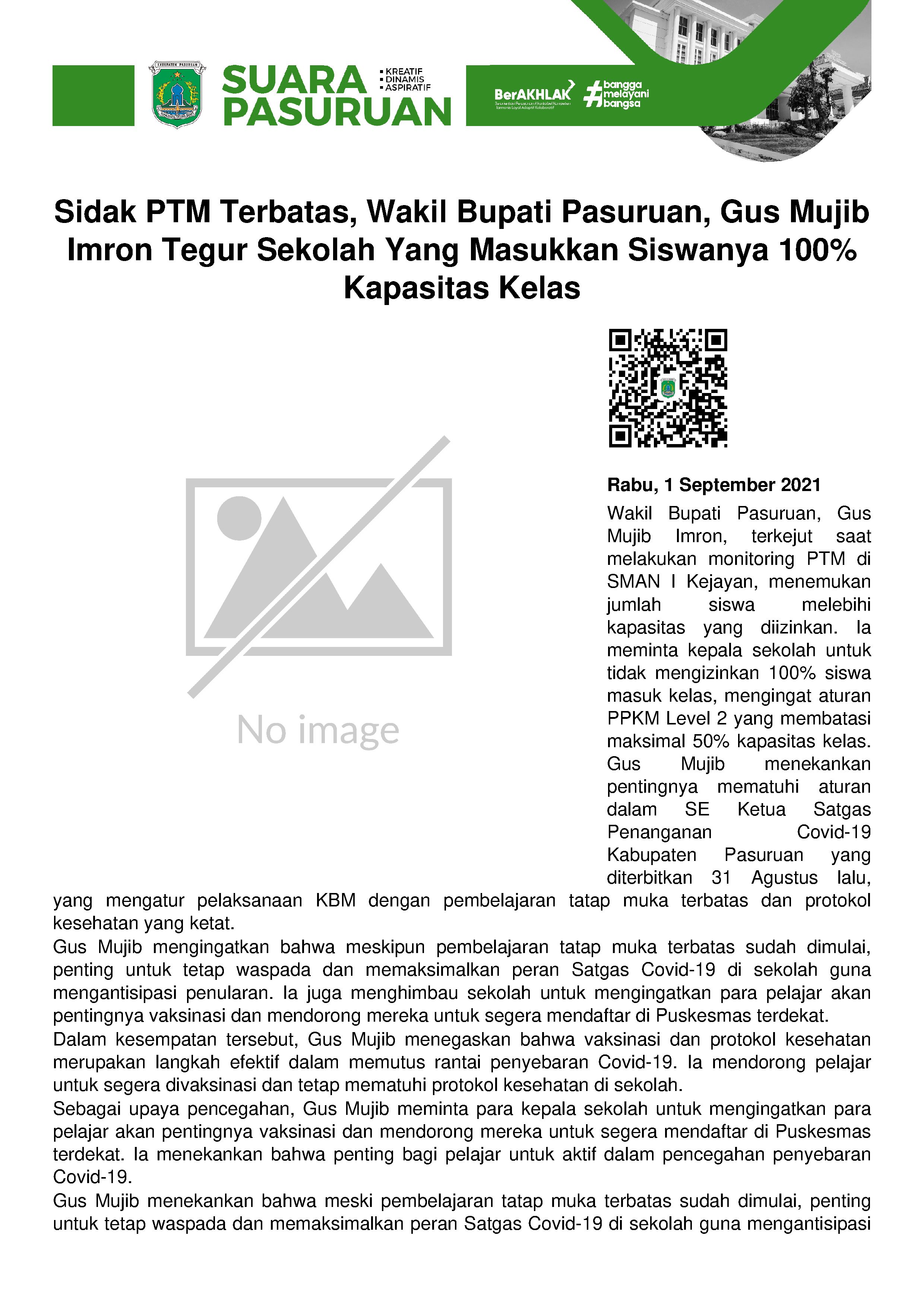Wakil Bupati Pasuruan, KH Abdul Mujib Imron (Gus Mujib) dibuat kaget ketika melakukan monitoring Pembelajaran Tatap Muka (PTM) di SMAN I Kejayan, Rabu (01/09/2021) pagi.