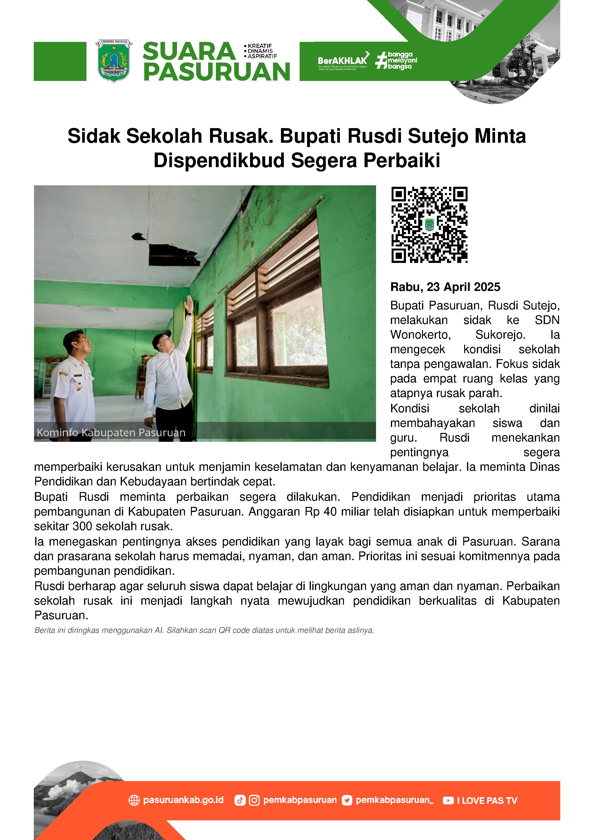 Sebagai real action, Mas Rusdi - sapaan akrab Bupati Pasuruan ini langsung meminta Dinas Pendidikan dan Kebudayaan Kabupaten Pasuruan untuk segera memperbaiki kerusakan agar anak-anak sekolah bisa mengikuti KBM dengan aman dan tenang.